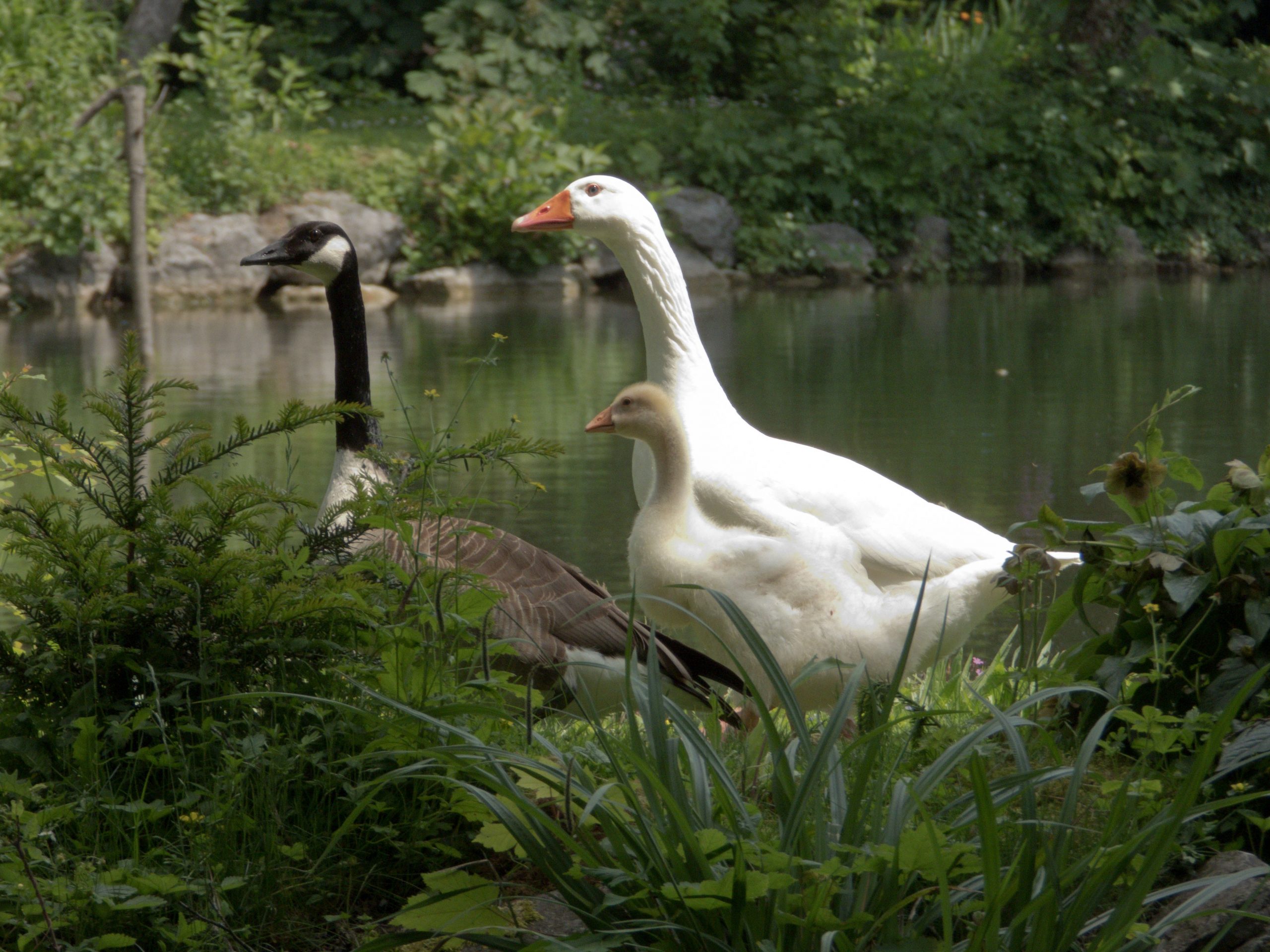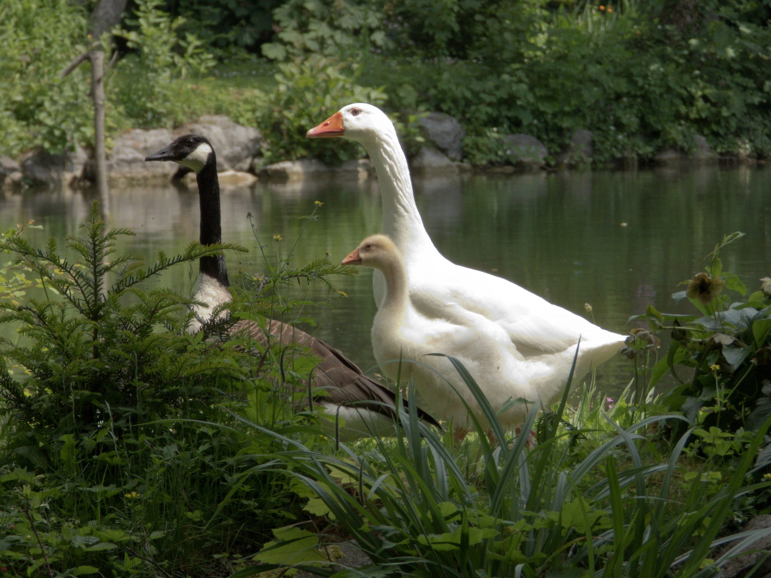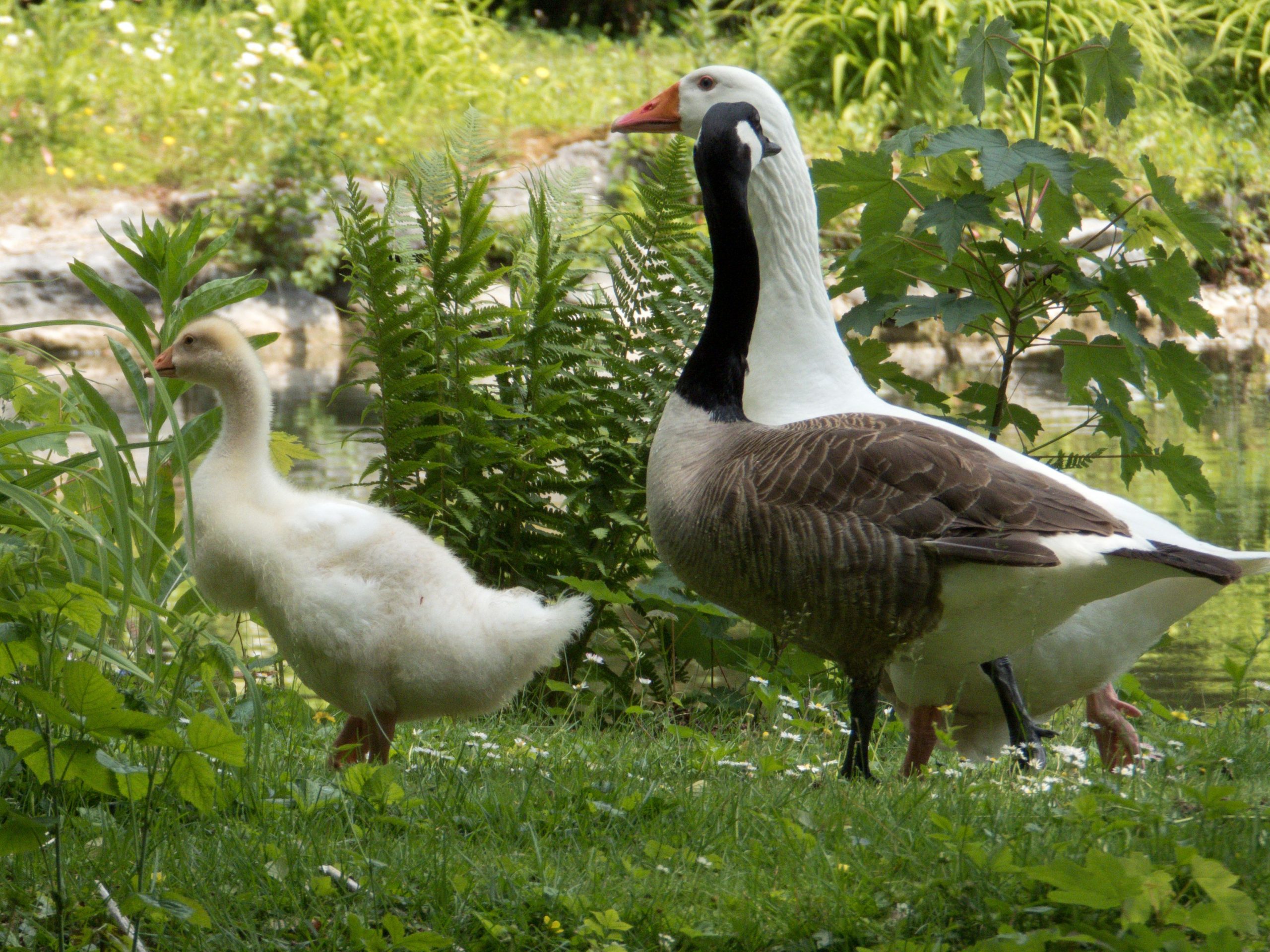 Die Gänseschar flüchtet vor dem Geräusch eines Gartengeräts, vielleicht ein Rasenmäher