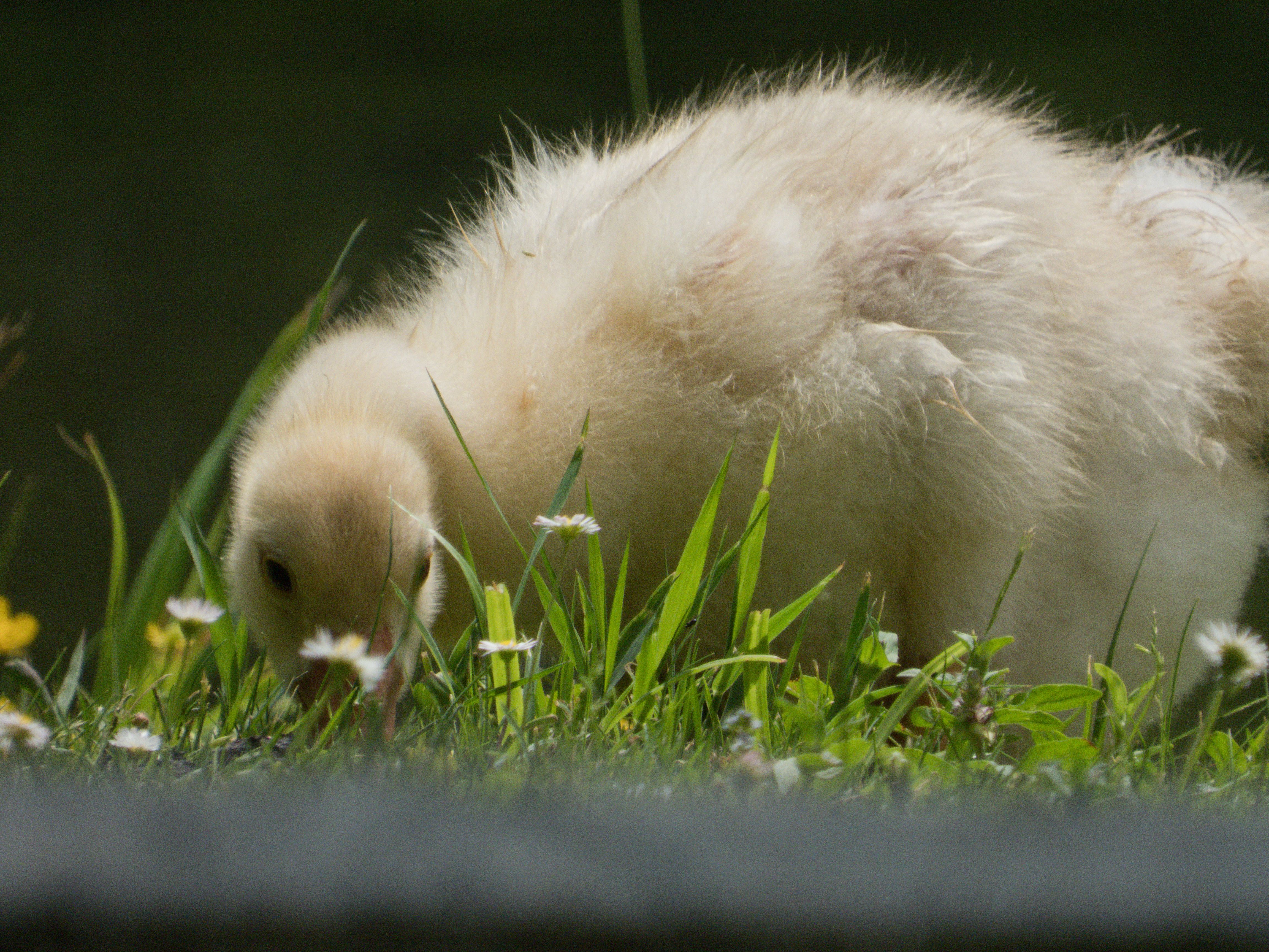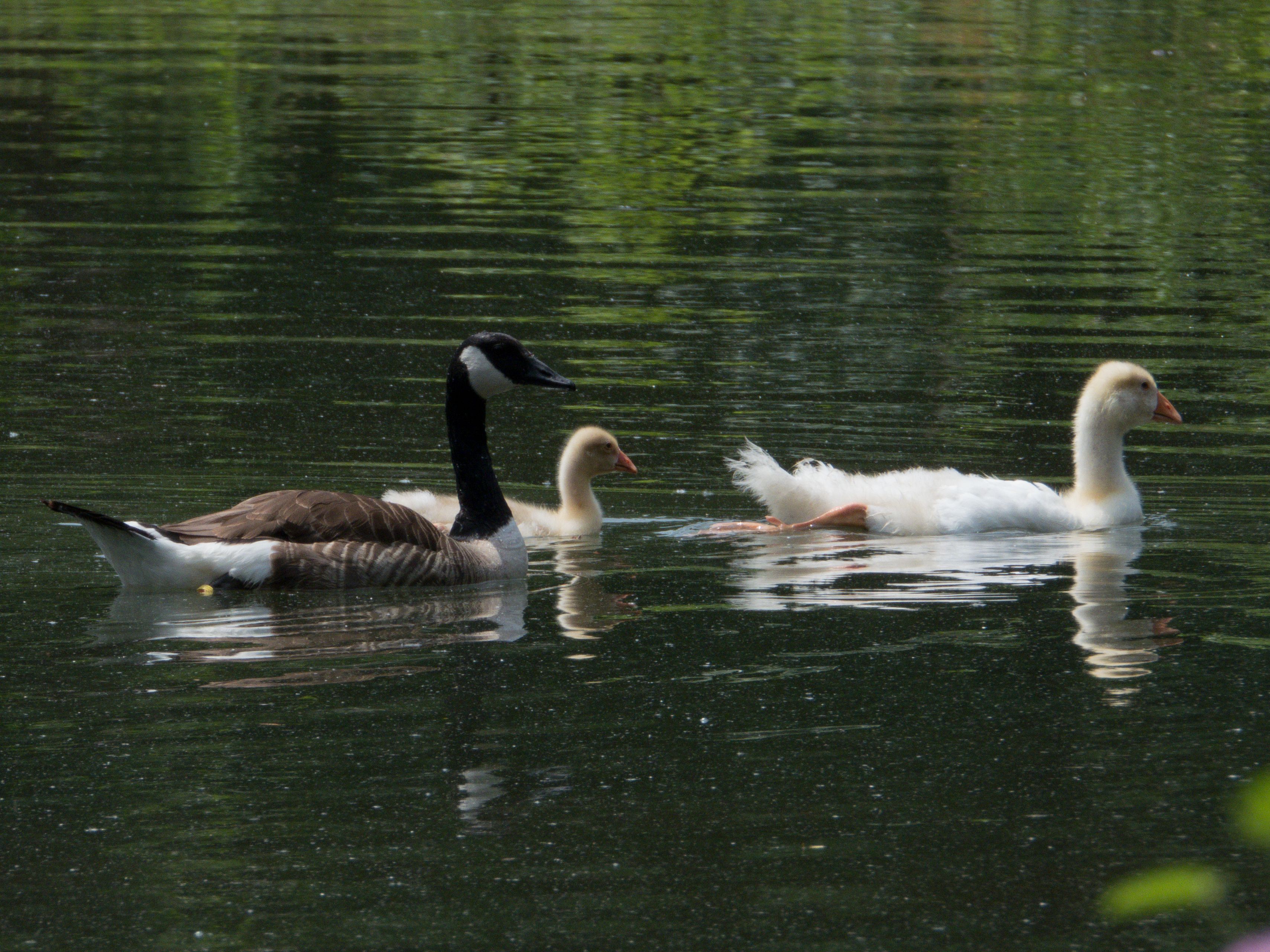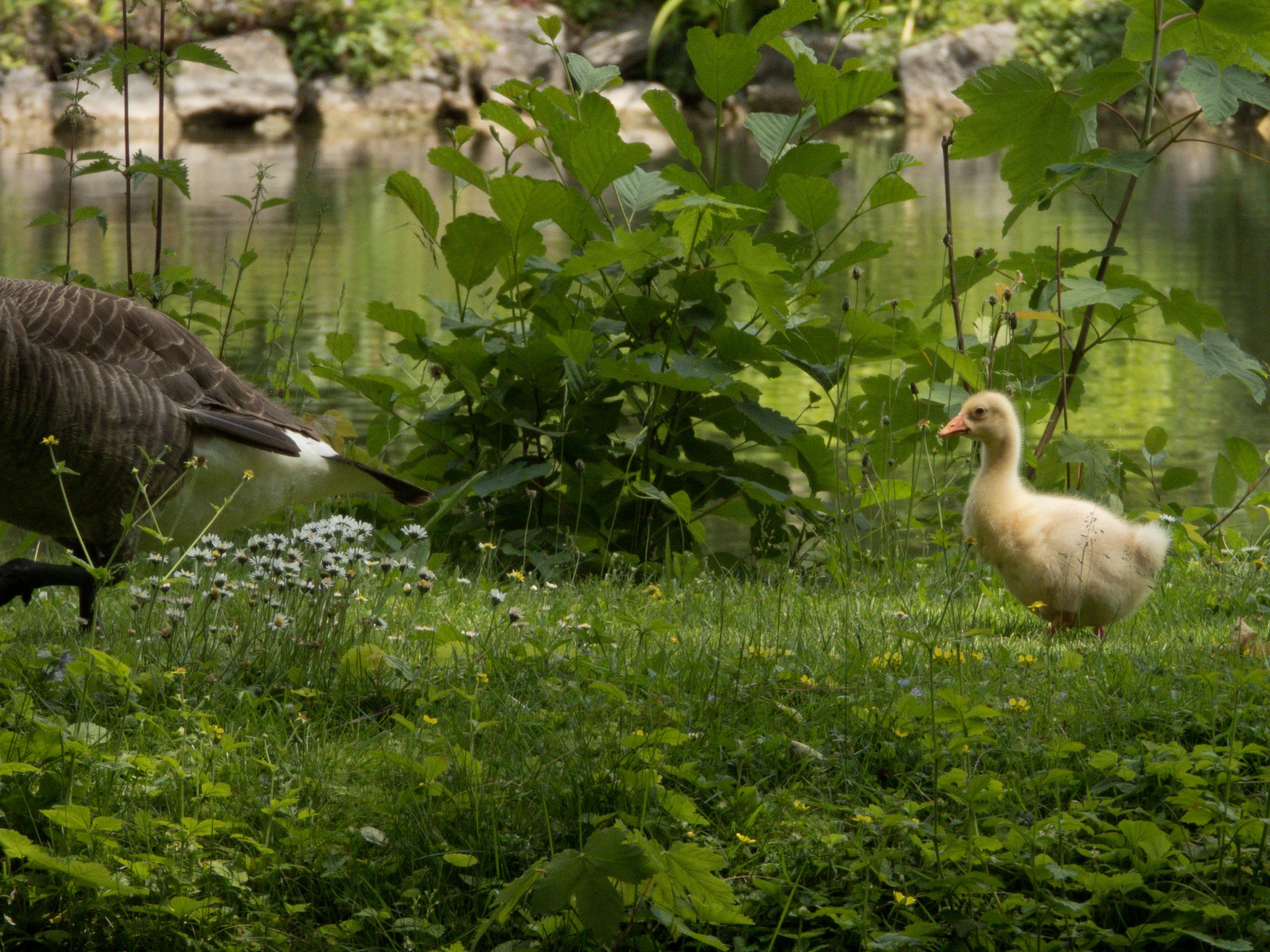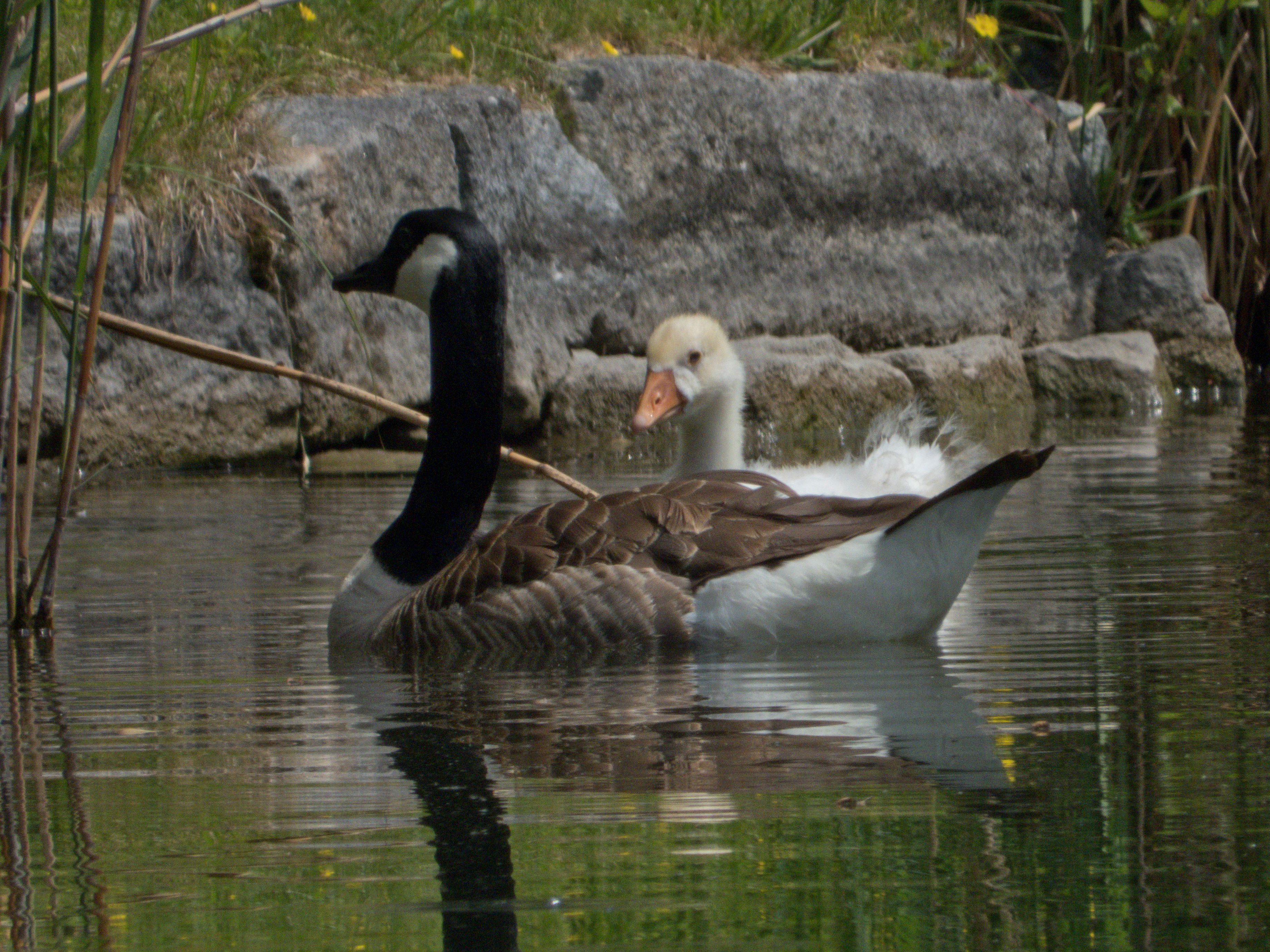 Aus dem Wasser war ein kurzer Gänseruf zu hören, wohl der einer Kanadagans. Gleich gesellt sich das Kleine wieder zu den anderen.