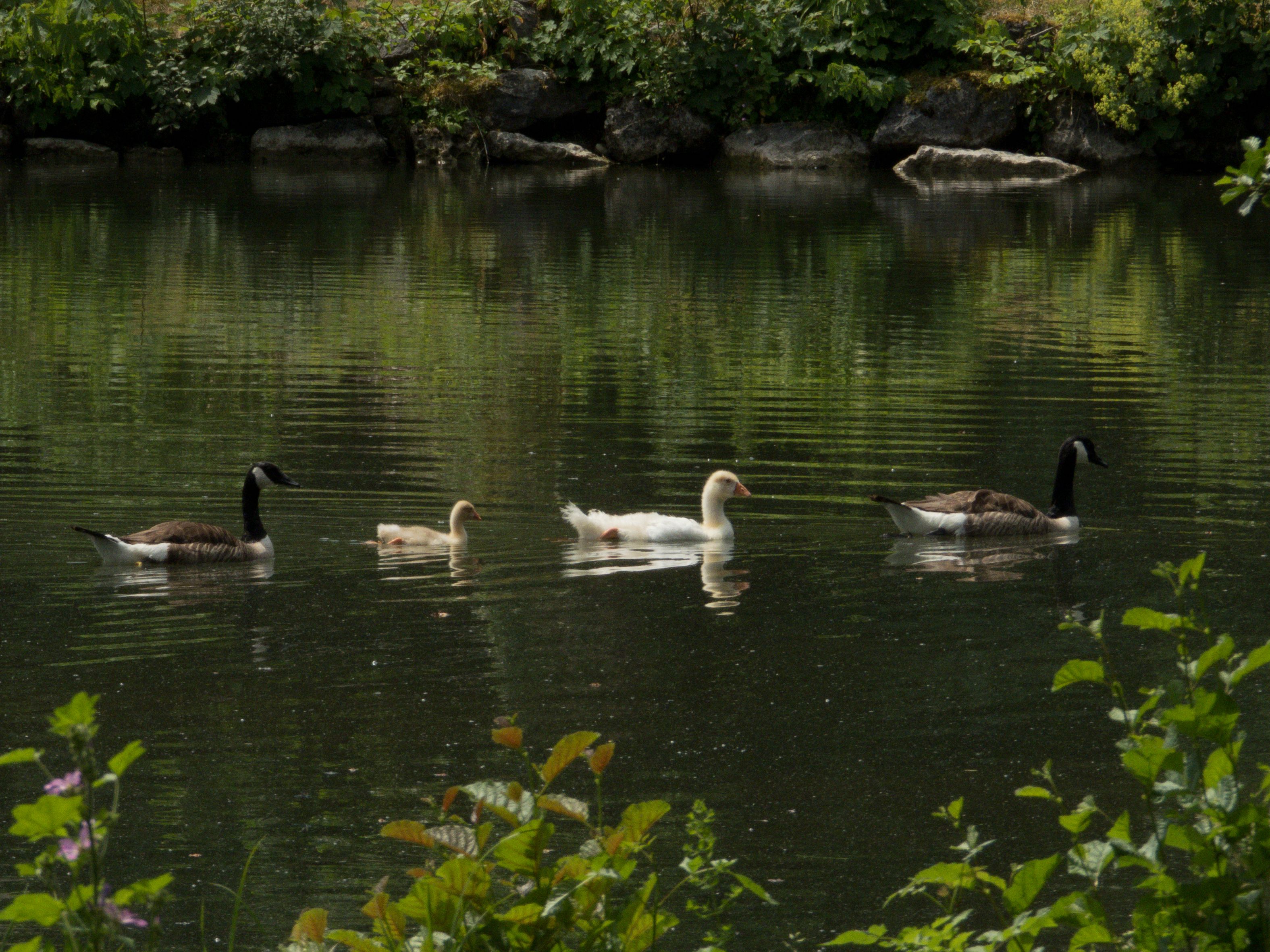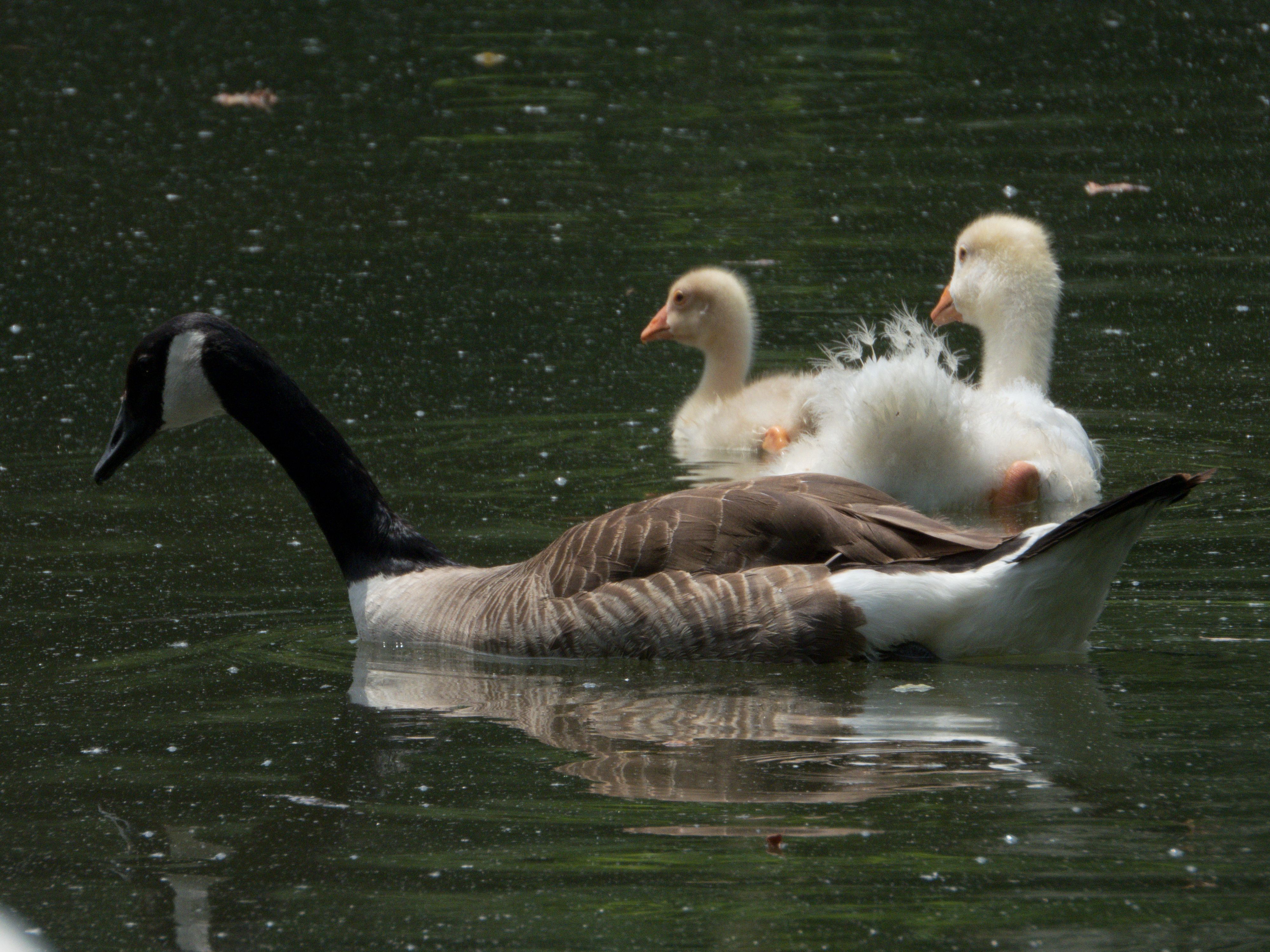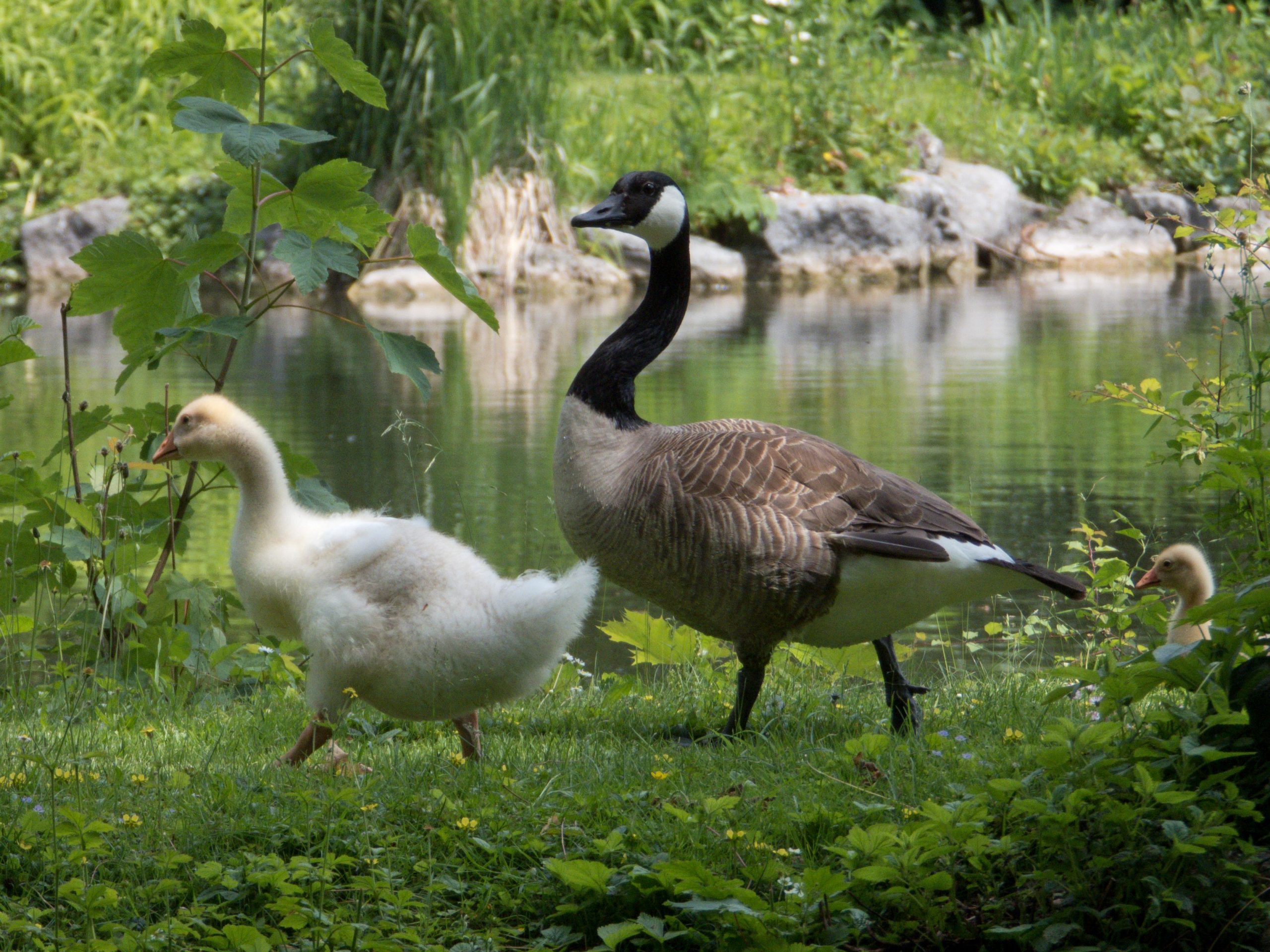 Aus dem Wasser war ein kurzer Gänseruf zu hören, wohl der einer Kanadagans. Gleich gesellt sich das Kleine wieder zu den anderen.