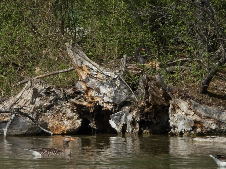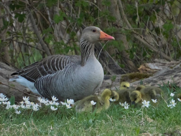 Kurzer Abstecher am Stausee in Schöngeising: Im See zwei Gössel-Familien, auf großer Insel zwei Graugansnester. Gut einsehbar ist die Ende April mittlerweile dicht bewachsene Insel allerdings nicht. Eine Paar führt acht noch sehr junge Gössel (Eizahn ist noch zu sehen), das andere Paar sechs Gänsekinder, die schon etwas älter sind.
