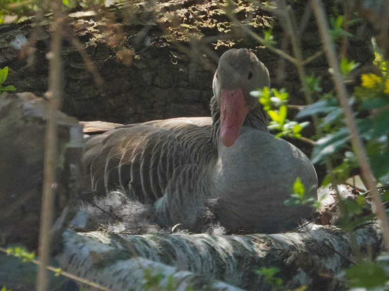 Graugans im Nest auf großer Insel. Aufgenommen vom Süddamm aus
