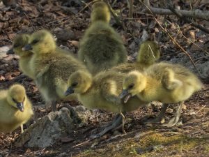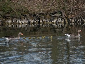 Acht Gössel auf einem Bild, Gans rechts die Gänsemutter. Konrad Lorenz erläutert in seinem „Jahr der Graugans“: „In den ersten Lebenstagen lernen die Gänschen, welche Futterpflanzen gut und welche weniger gut schmecken. Das geschieht einerseits dadurch, dass sie viele verschiedene Pflanzen beknabbern, andererseits, indem sie genau hinschauen, was die Eltern fressen.“ Und weiter: „Ein enger Familienzusammenhalt ist für die Gössel lebenswichtig. Sobald die Mutter sich in Bewegung setzt, folgen sie ihr dicht auf dem Fuße nach.“