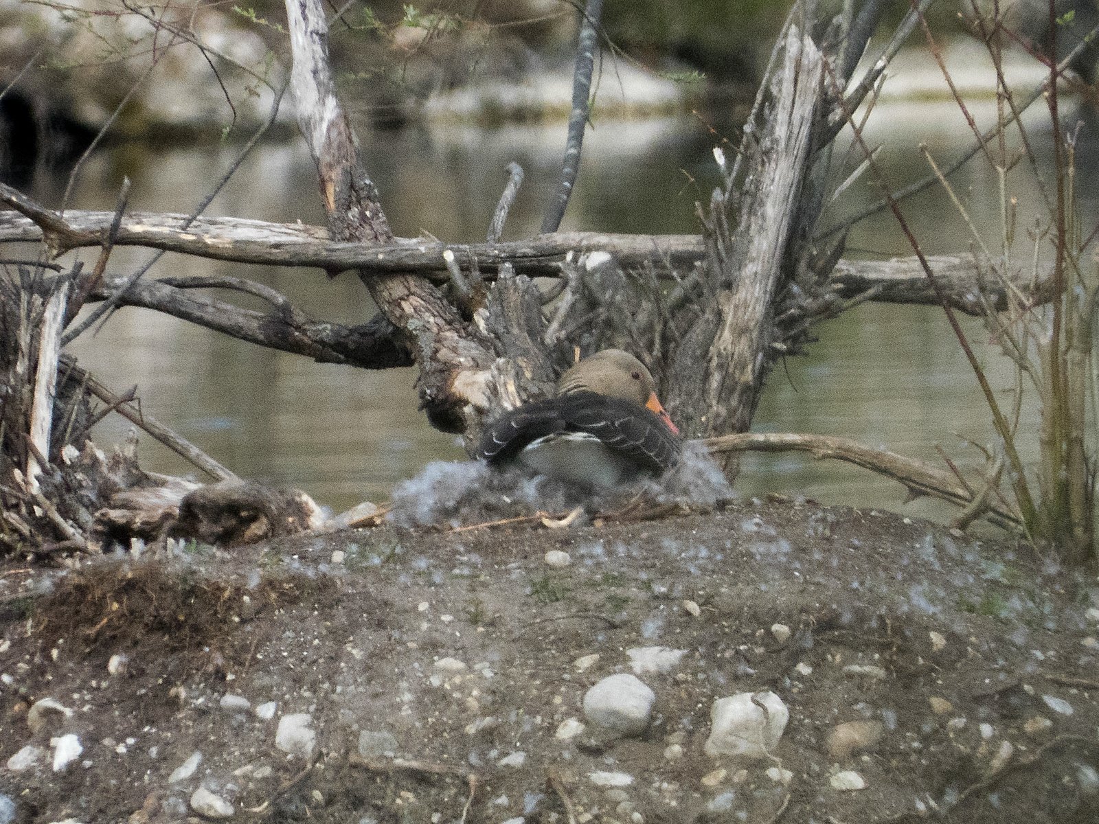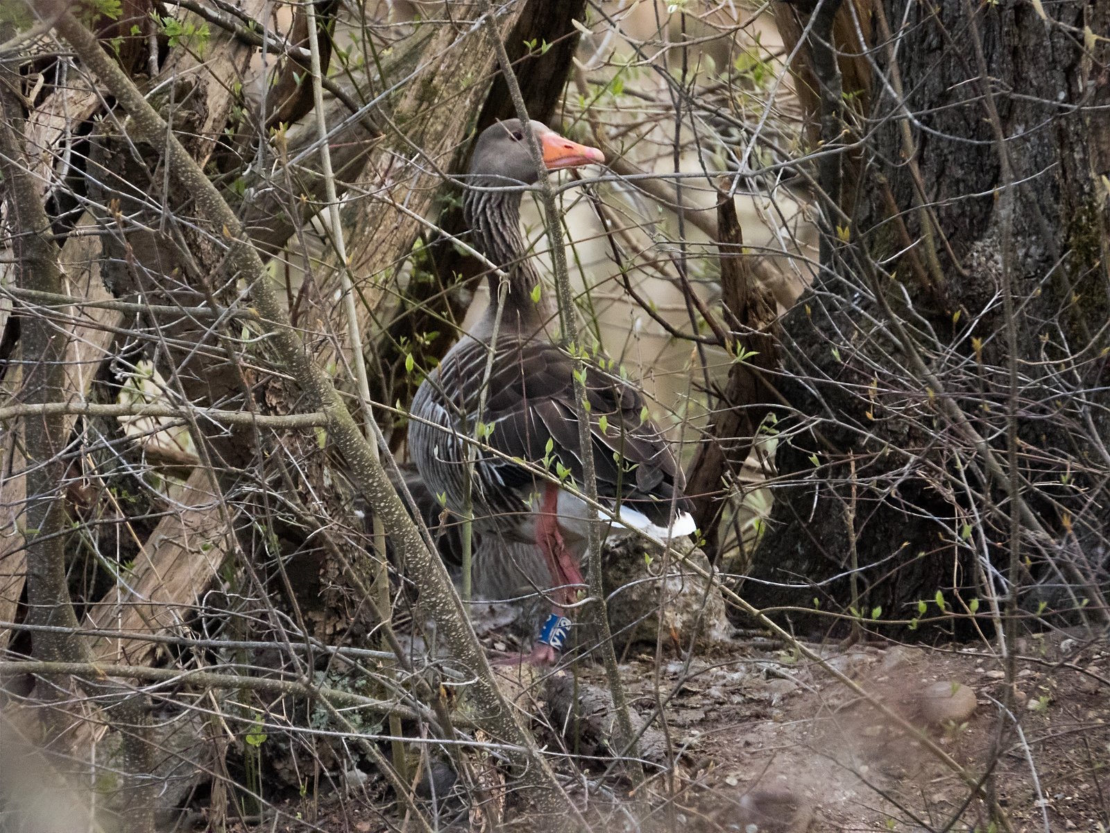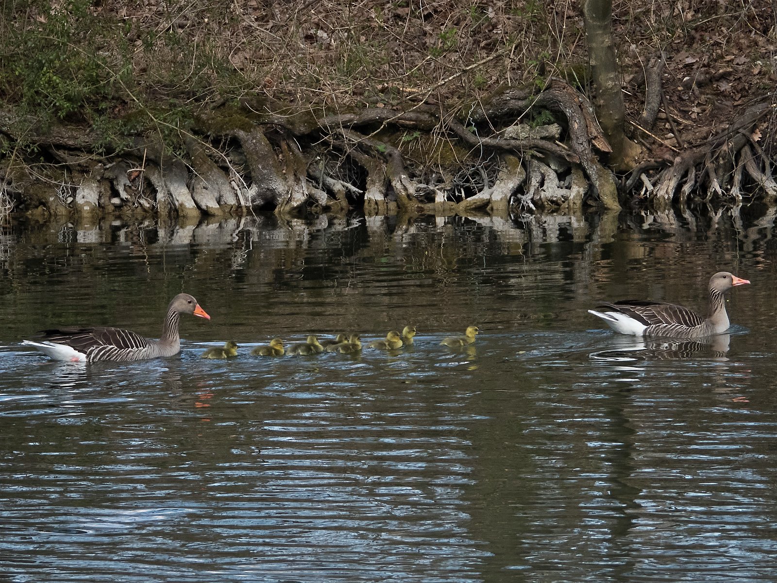Gestern noch war nur ein einziges Gänseküken im Nest der Frau von Graugansganter mit Fußring Y78 kurz sichtbar. Heute verließ die Gänsemutter das Nest zusammen mit acht Gösseln. Im Amperstausee brüten jetzt noch sechs Graugänse. Daneben befinden sich im Nest ein Höckerschwan und drei Kanadagänse.
