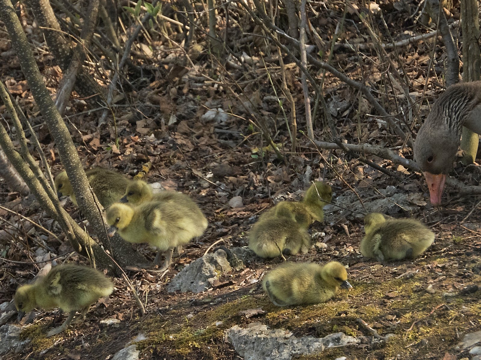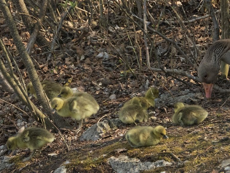 Acht Gössel auf einem Bild, Gans rechts die Gänsemutter. Konrad Lorenz erläutert in seinem „Jahr der Graugans“: „In den ersten Lebenstagen lernen die Gänschen, welche Futterpflanzen gut und welche weniger gut schmecken. Das geschieht einerseits dadurch, dass sie viele verschiedene Pflanzen beknabbern, andererseits, indem sie genau hinschauen, was die Eltern fressen.“ Und weiter: „Ein enger Familienzusammenhalt ist für die Gössel lebenswichtig. Sobald die Mutter sich in Bewegung setzt, folgen sie ihr dicht auf dem Fuße nach.“