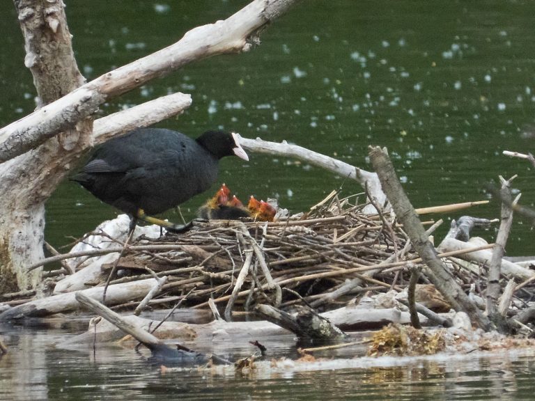 Mitten im See derzeit mindestens zwei Blesshuhn-Nester mit Nachwuchs.