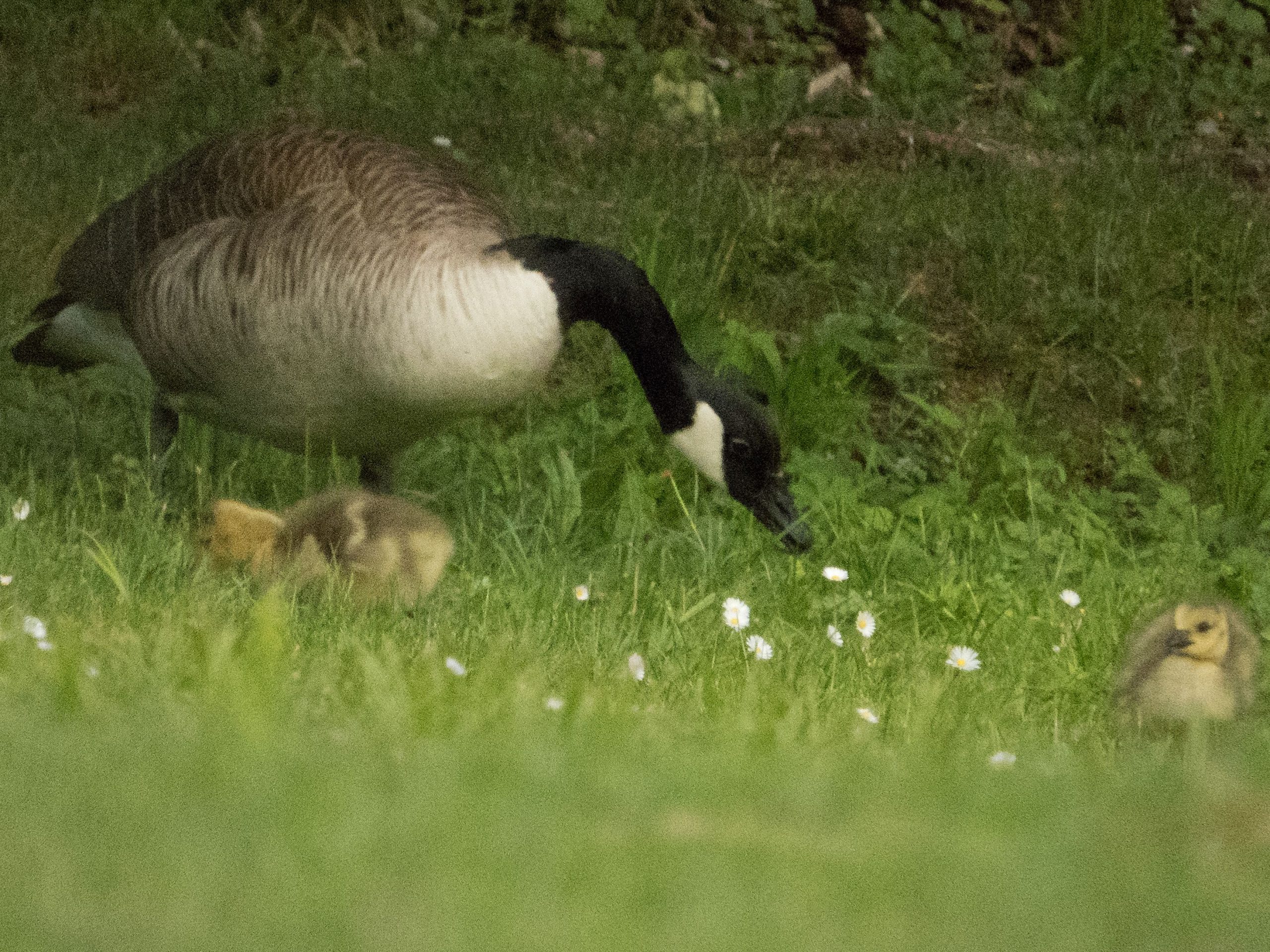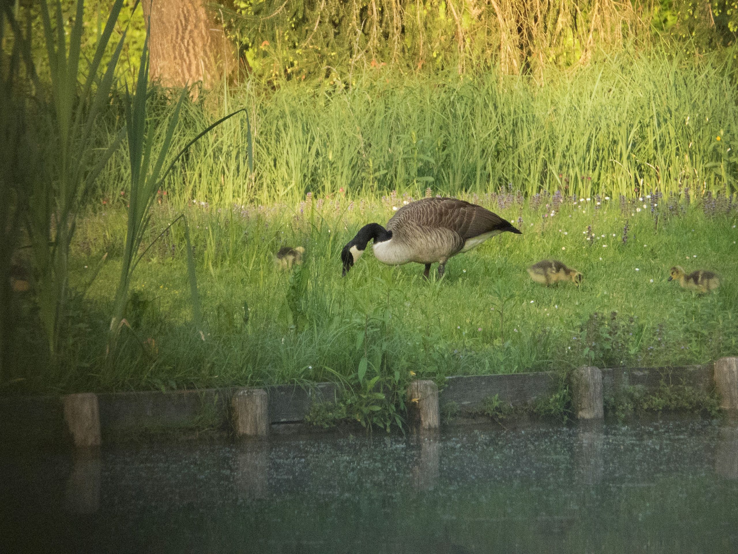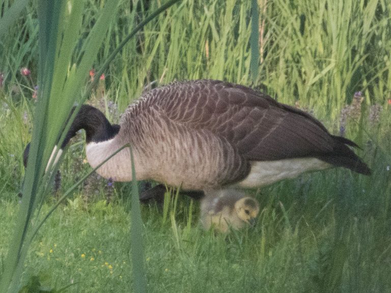 Die Gans war vom 9. April bis einschließlich 10. Mai im Nest zu sehen; am 12. Mai 2020 führte das Paar insgesamt fünf Gössel, wobei es sich bei einem Jungtier um ein Graugans-Küken handelte. Auch am 16. Mai 2020 waren es noch die fünf Gössel. Heute, im Gebiet der abgesperrten Fischteiche, zählte die Familie nur noch vier Gänsekinder – beobachtet um 18.45 Uhr und später um 19.45 Uhr. Den Aufnahmen nach zu urteilen fehlt wohl das Graugans-Gössel. Ebenfalls im Fischteichgebiet anwesend: Weiteres Kanadaganspaar mit einem Gössel (am Kopf weißgefleckte Kanadagansmutter) und eine Graugans-Familie mit vier schon etwas älteren Jungen.