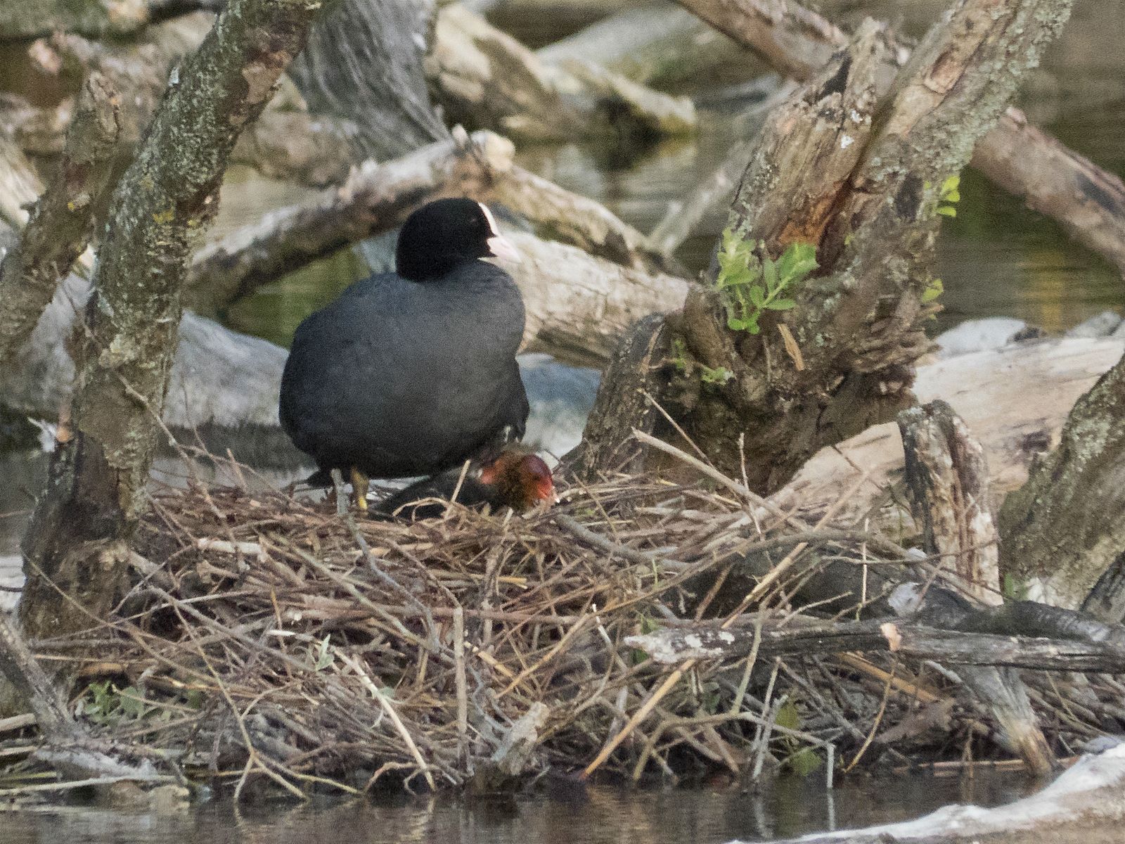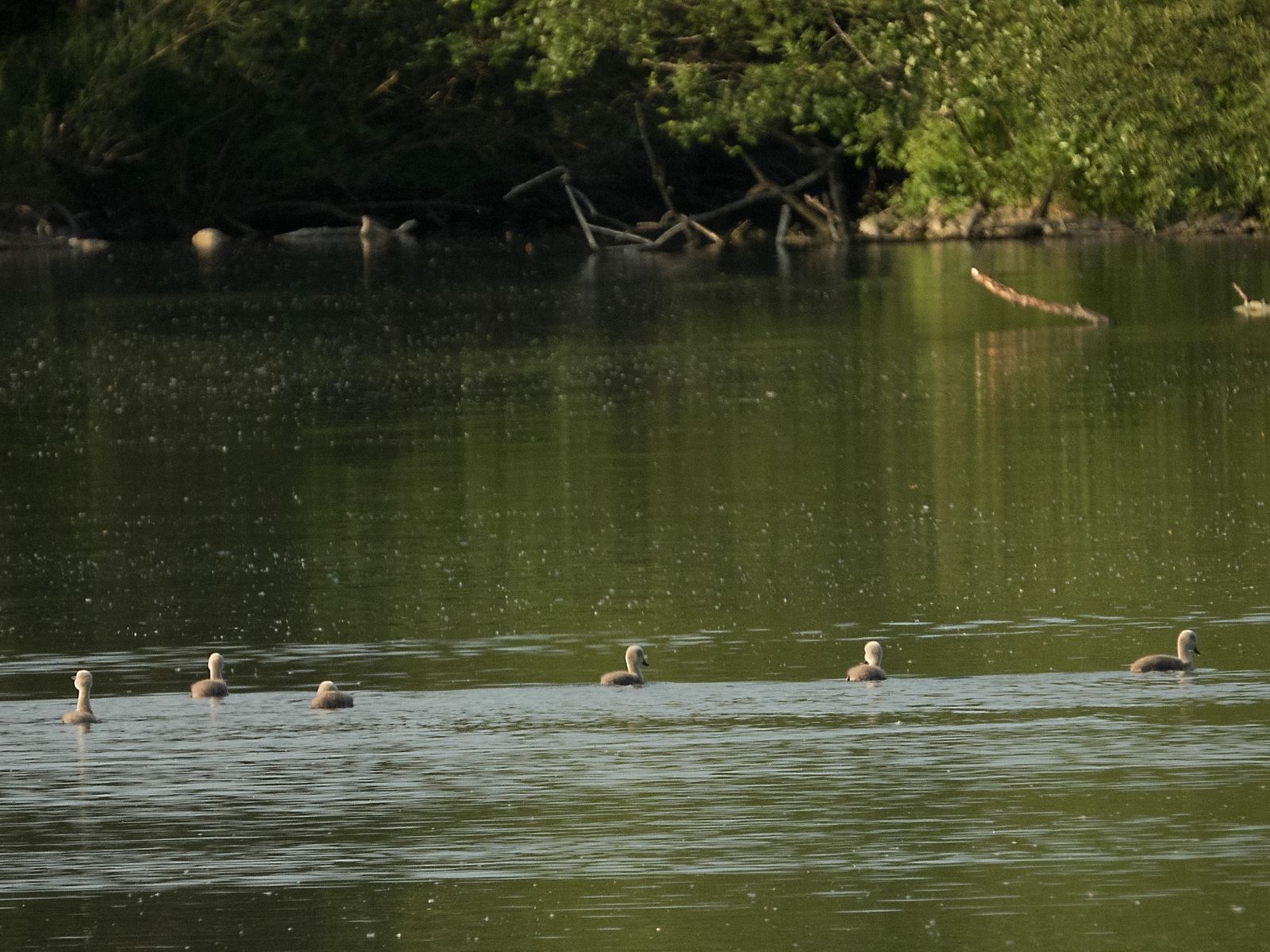 Im See ging der Revierschwan auf Kanadagans-Jagd. Im Bild treibt der Schwan eine der beiden dort anwesenden Kanadagänse auf die ehemalige Kanadagans-Brutinsel. Rechts neben dem Baumstamm war der Nestplatz. Das einzige Gössel ging dem Paar verloren.