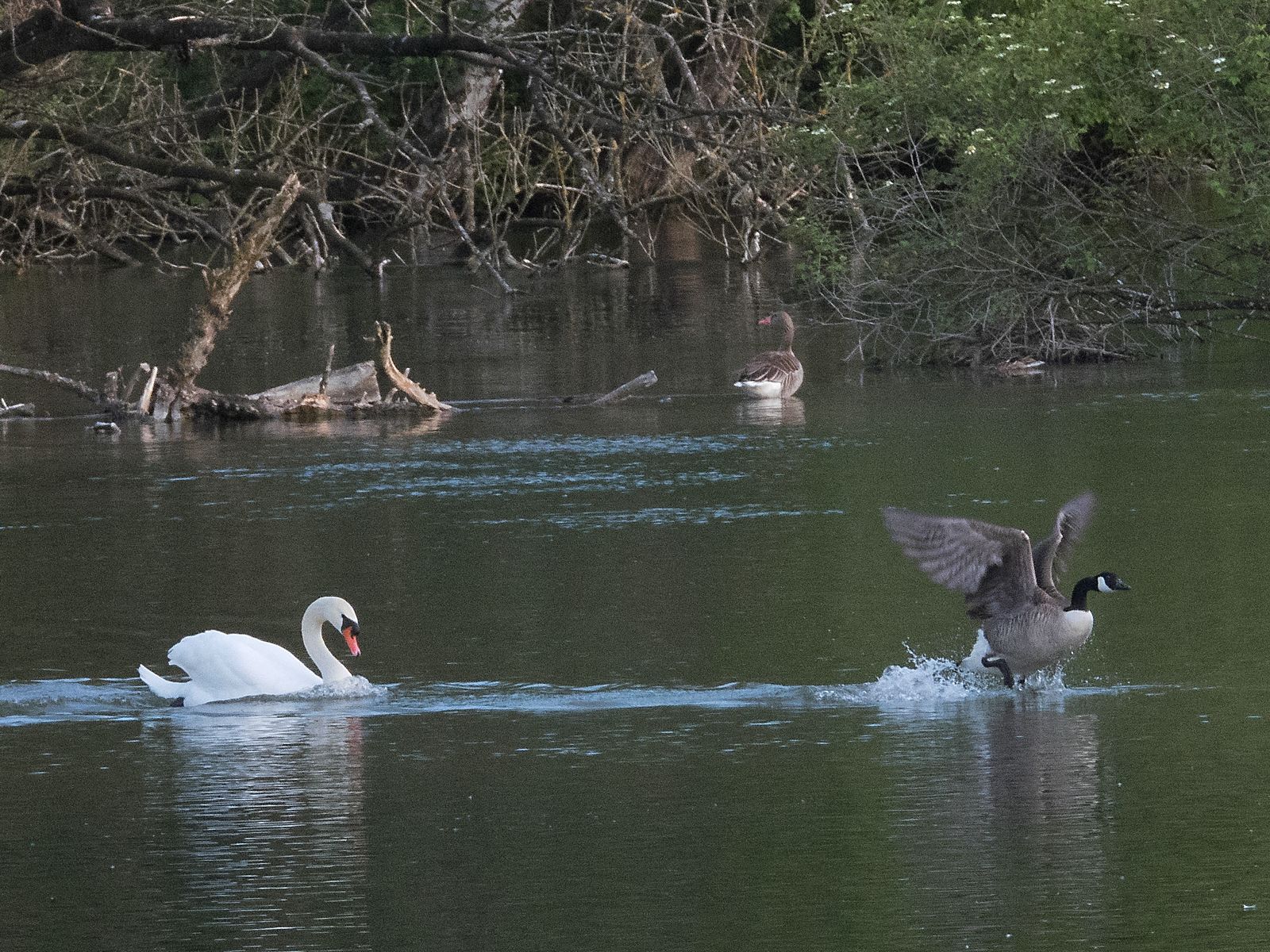 Den Gänsehybriden lässt der Schwan links liegen und konzentriert sich allein auf die Kanadagans (mutmaßlich der Ganter, während Frau Gemahlin auf die Insel floh).
