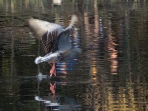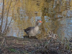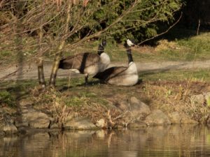 Zwei Kanadaganspaare streiten offenbar um die Brutinsel im Bergerweiher. Gegen Mittag waren noch beide Paare, sich beschimpfend, im Wasser. Gegen Abend dann nur noch ein Paar im Weiher, das andere Paar verweilte am Ufer.