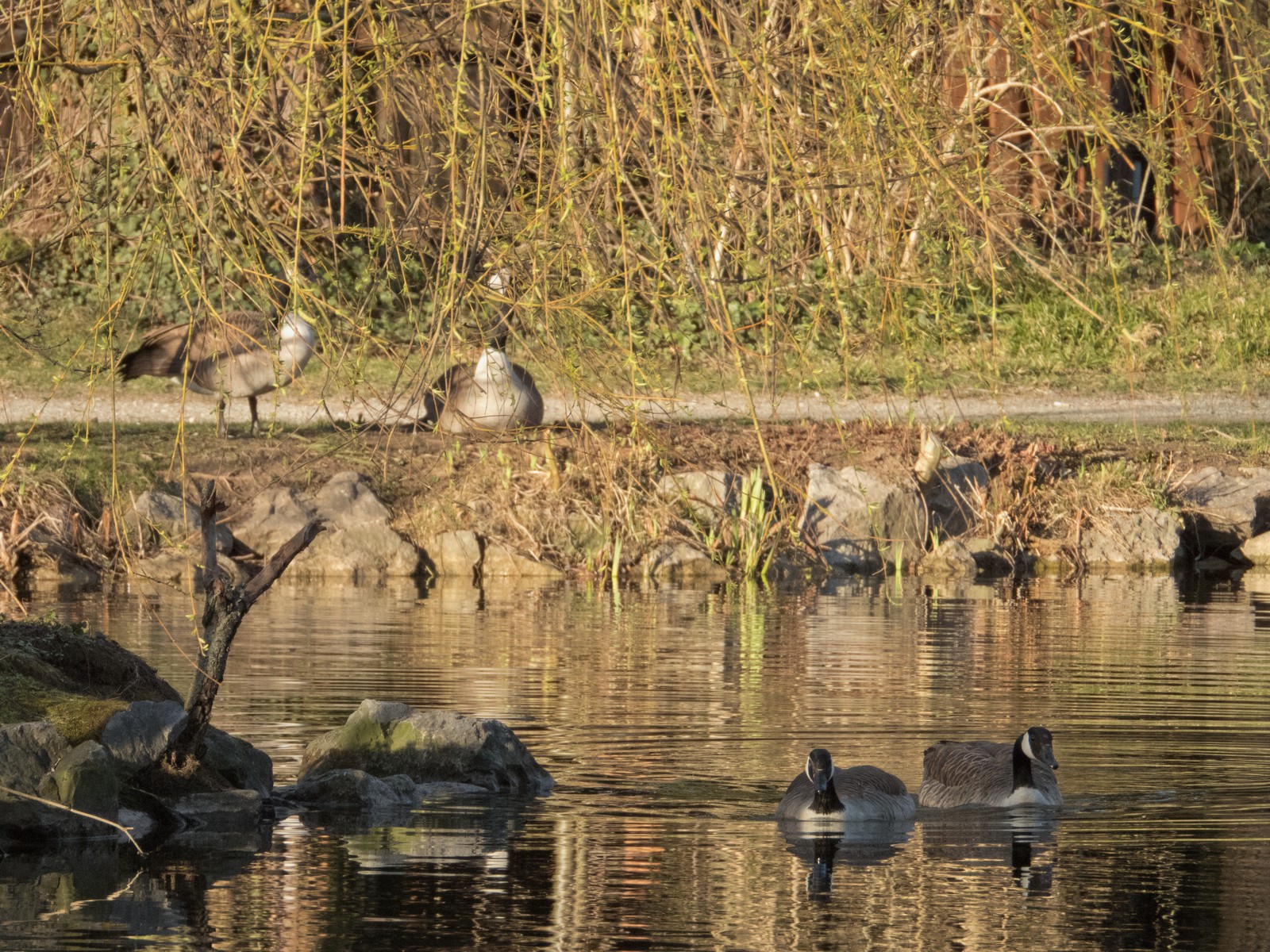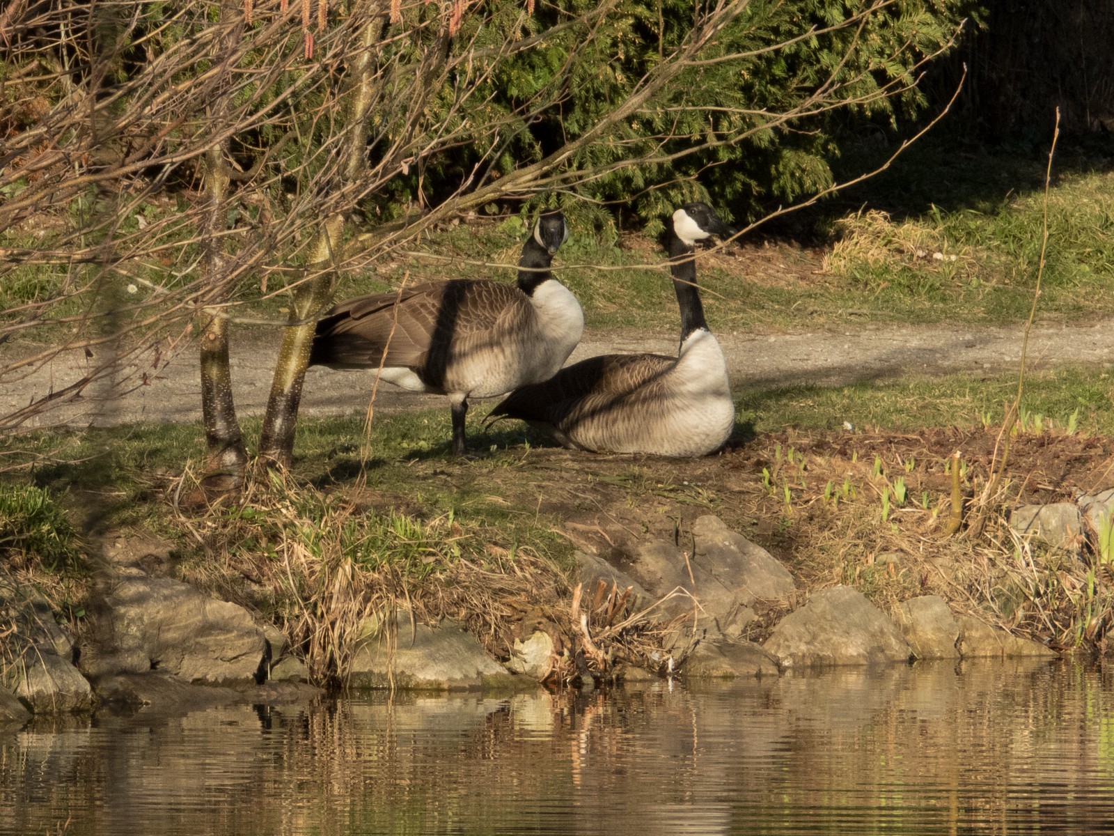 Zwei Kanadaganspaare streiten offenbar um die Brutinsel im Bergerweiher. Gegen Mittag waren noch beide Paare, sich beschimpfend, im Wasser. Gegen Abend dann nur noch ein Paar im Weiher, das andere Paar verweilte am Ufer.