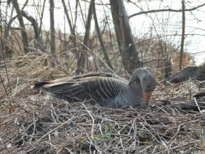 Nachfolgend ein Film: Bei anregender “Hintergrundmusik” setzt sich die auf kleiner Insel neben der Sitzbankgruppe brütende Graugans ins Nest.