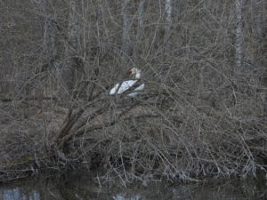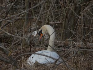 Auf einem Inselplatz hat es sich heute ein Höckerschwan gemütlich gemacht. Die Frage ist, ob der Platz tatsächlich das künftige Nest sein wird. Vor wenigen Jahren gab es einen ähnlichen Fall: Das Männchen belegte diesen Platz für kurze Zeit, gebrütet wurde später aber auf der kleinen Insel neben der Sitzbankgruppe; auf jener Insel also, auf der weiter vorne auf einer kleinen Anhöhe eine Graugans (siehe Film oben) brütet.