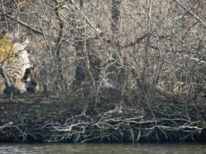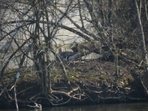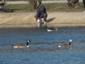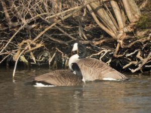 Derzeit halten sich sechs Kanadagänse im See auf. Offensichtlich drei Paare. Eine kleine Insel gegenüber der Eisvogelwand ist schon reserviert von einem Kanadaganspaar. Sobald eine Graugans Anstalten macht, die Insel zu betreten, geben die beiden Kanadagänse ein lautstarkes Konzert. Und vertreiben wütend die Graugans. Eine Graugans ist sichtlich hartnäckig um die Insel bemüht. Sie zieht aber immer den “Kürzeren”.