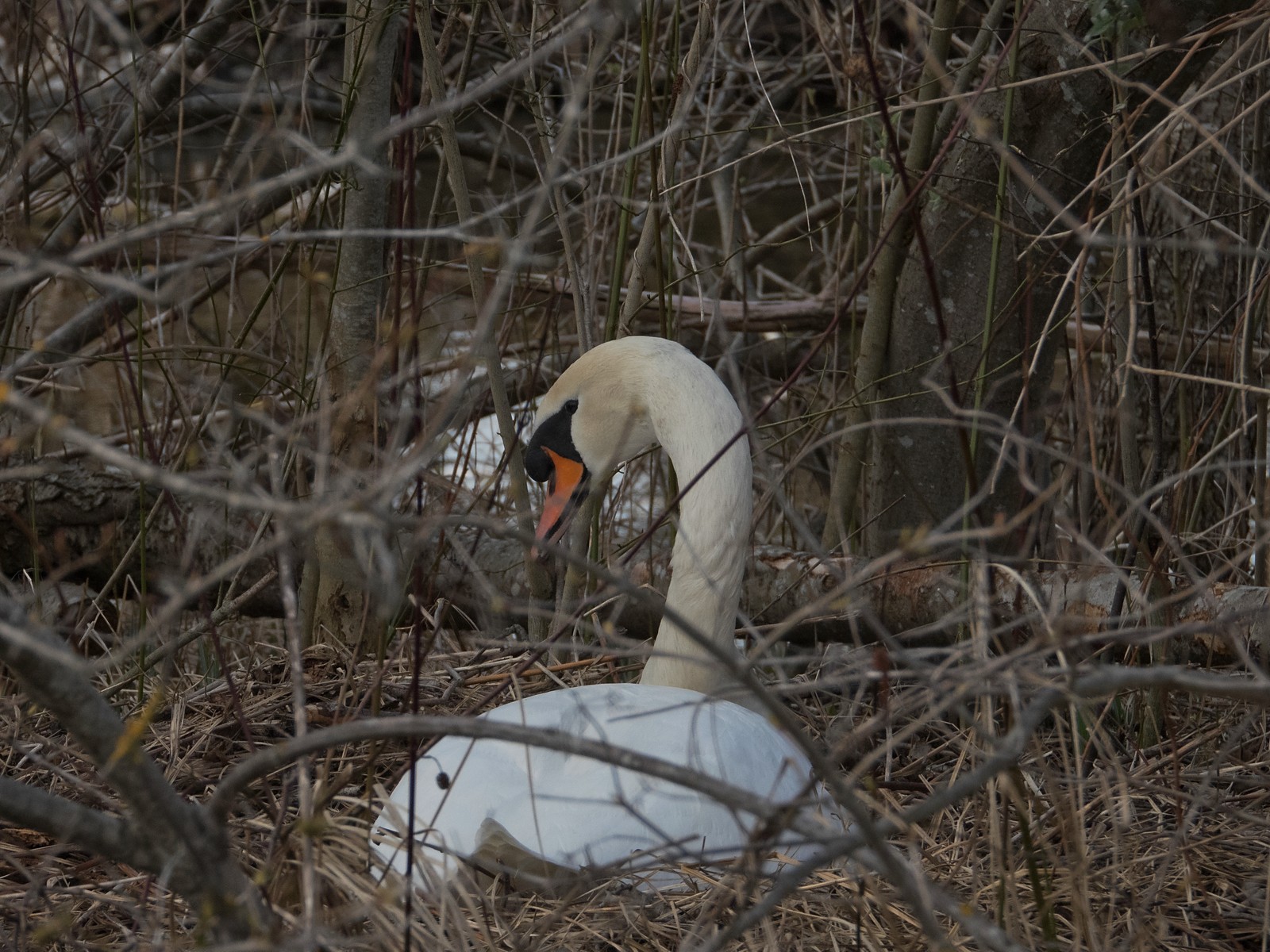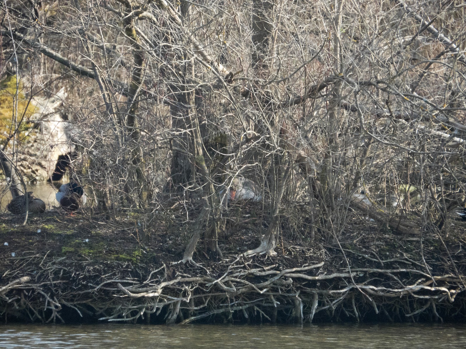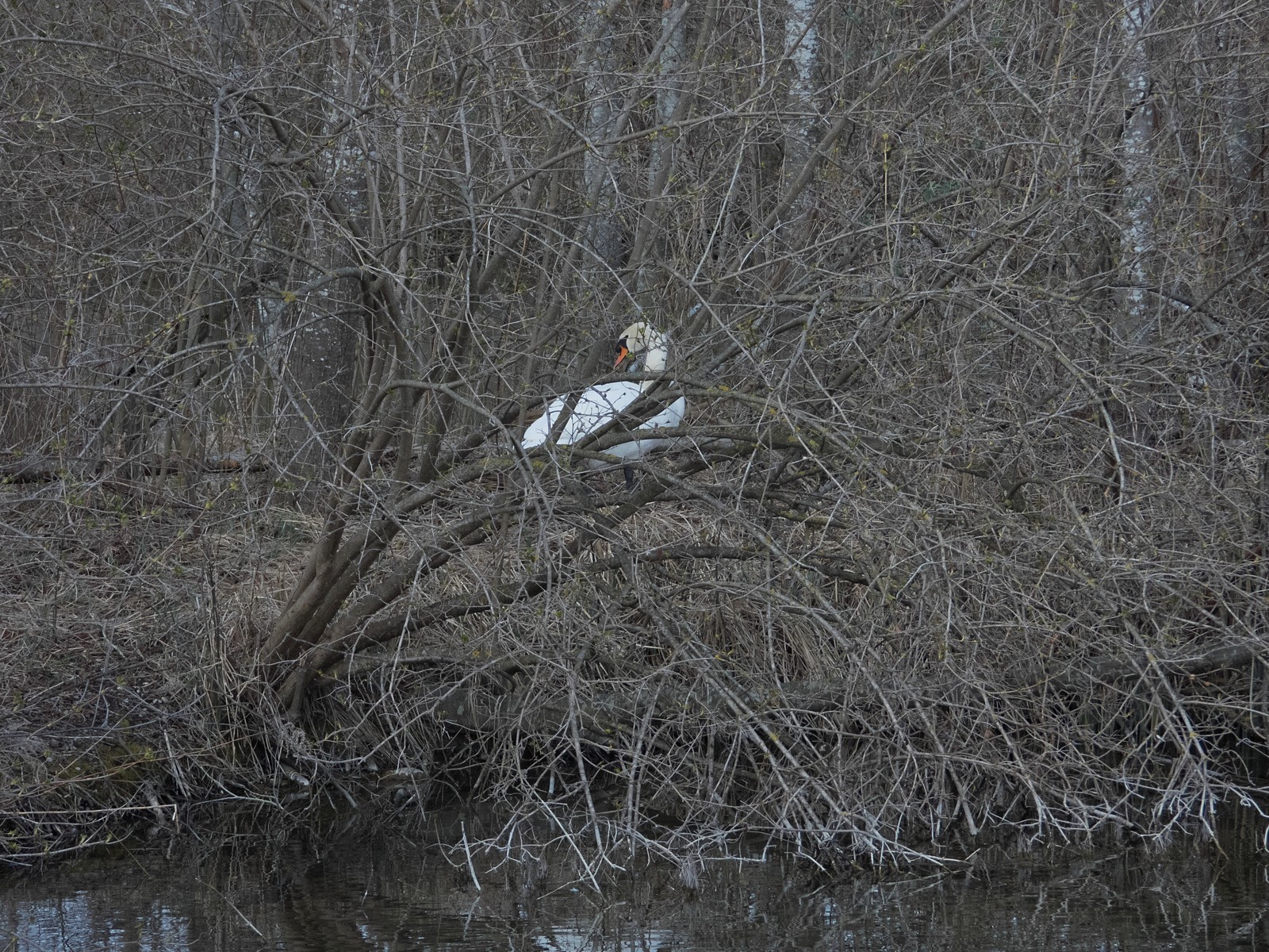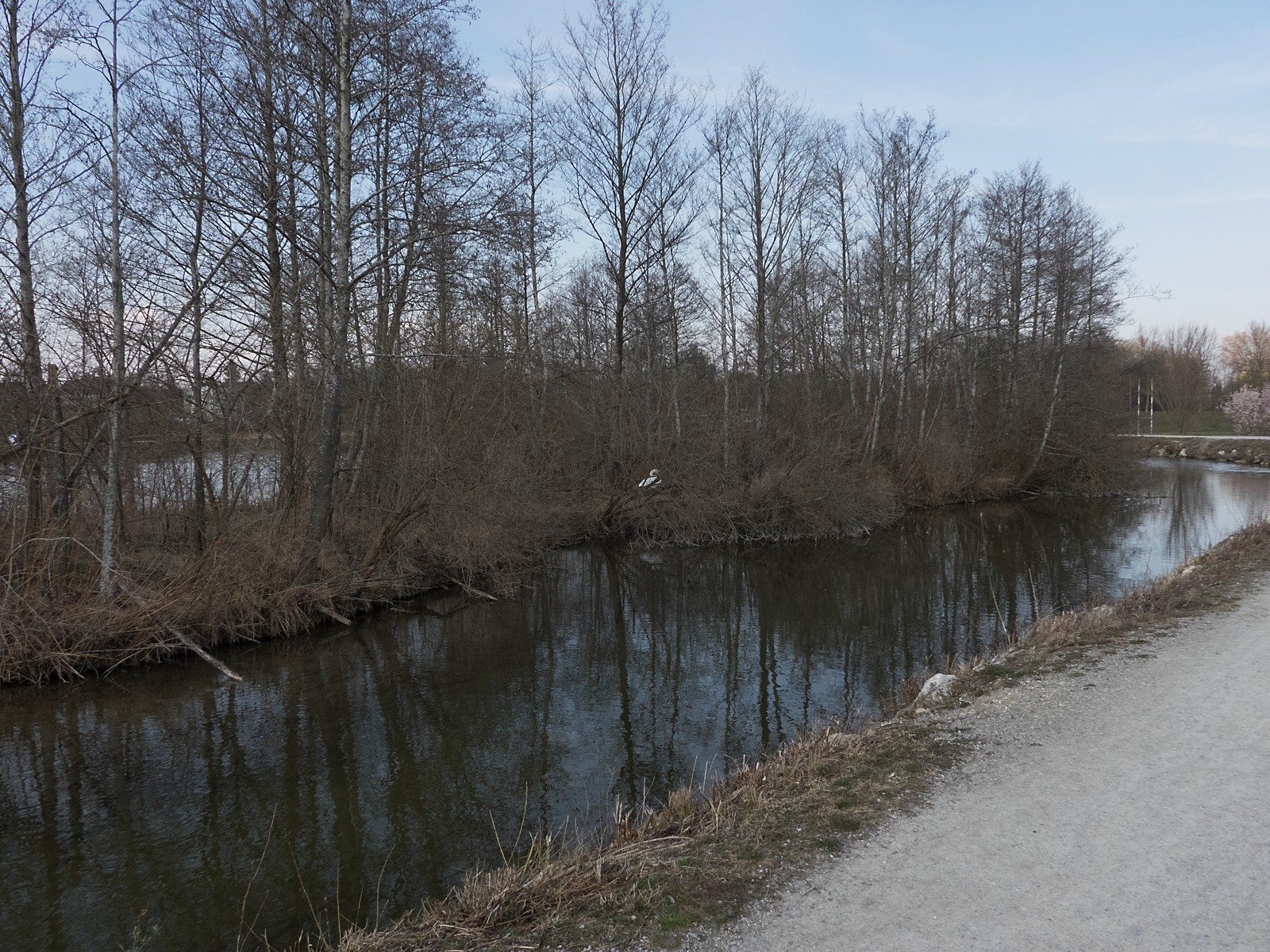 Auf einem Inselplatz hat es sich heute ein Höckerschwan gemütlich gemacht. Die Frage ist, ob der Platz tatsächlich das künftige Nest sein wird. Vor wenigen Jahren gab es einen ähnlichen Fall: Das Männchen belegte diesen Platz für kurze Zeit, gebrütet wurde später aber auf der kleinen Insel neben der Sitzbankgruppe; auf jener Insel also, auf der weiter vorne auf einer kleinen Anhöhe eine Graugans (siehe Film oben) brütet.