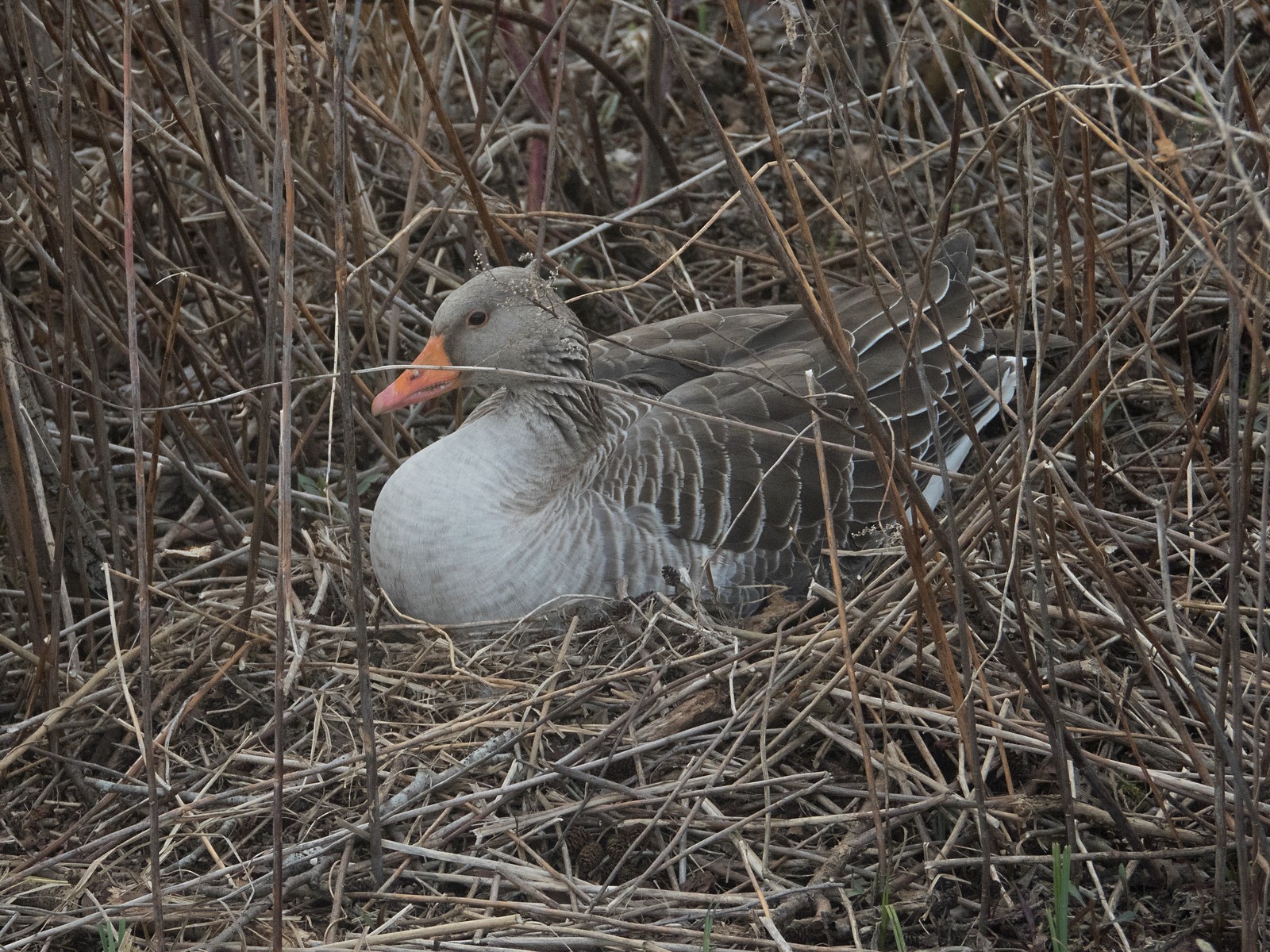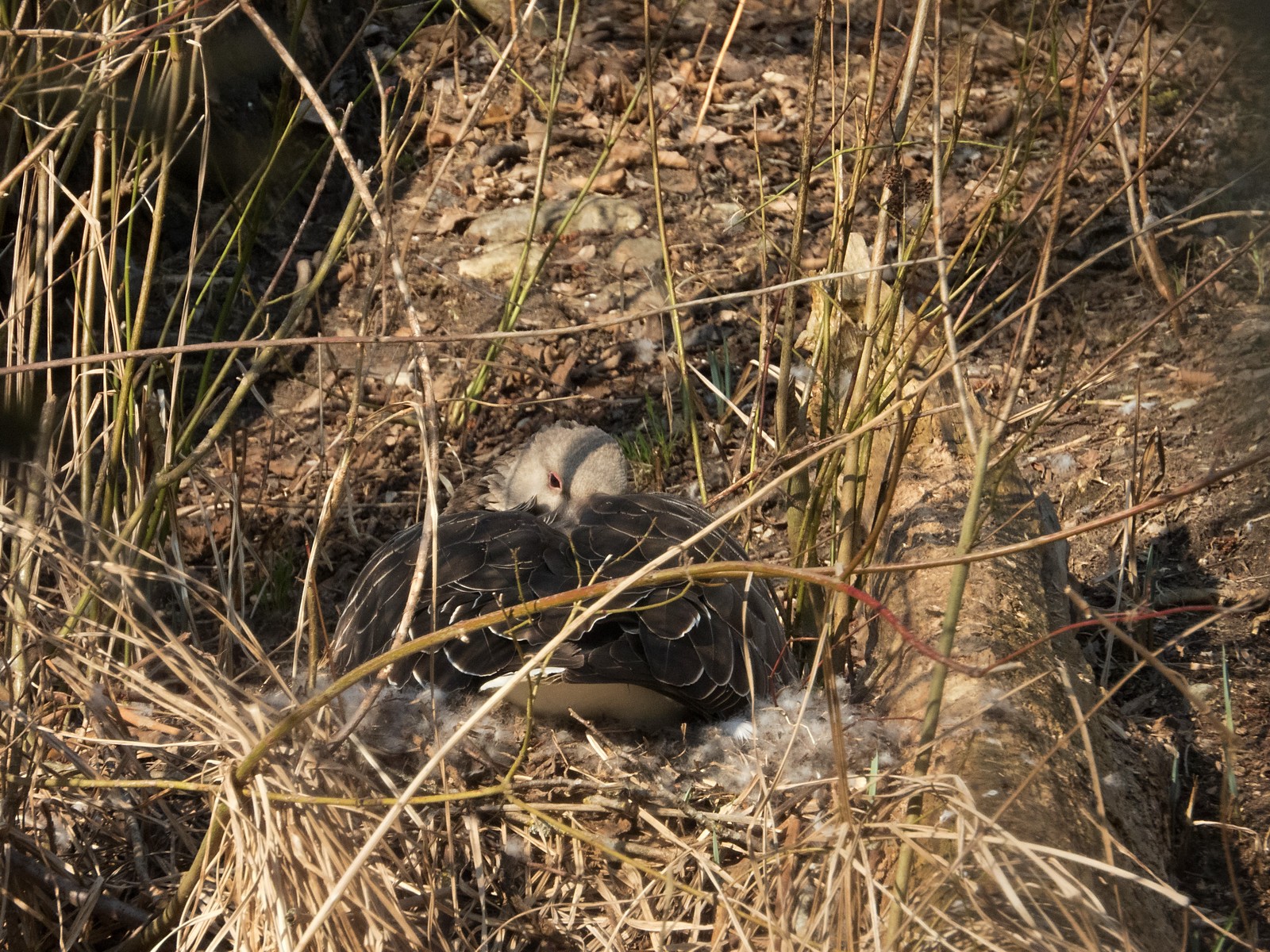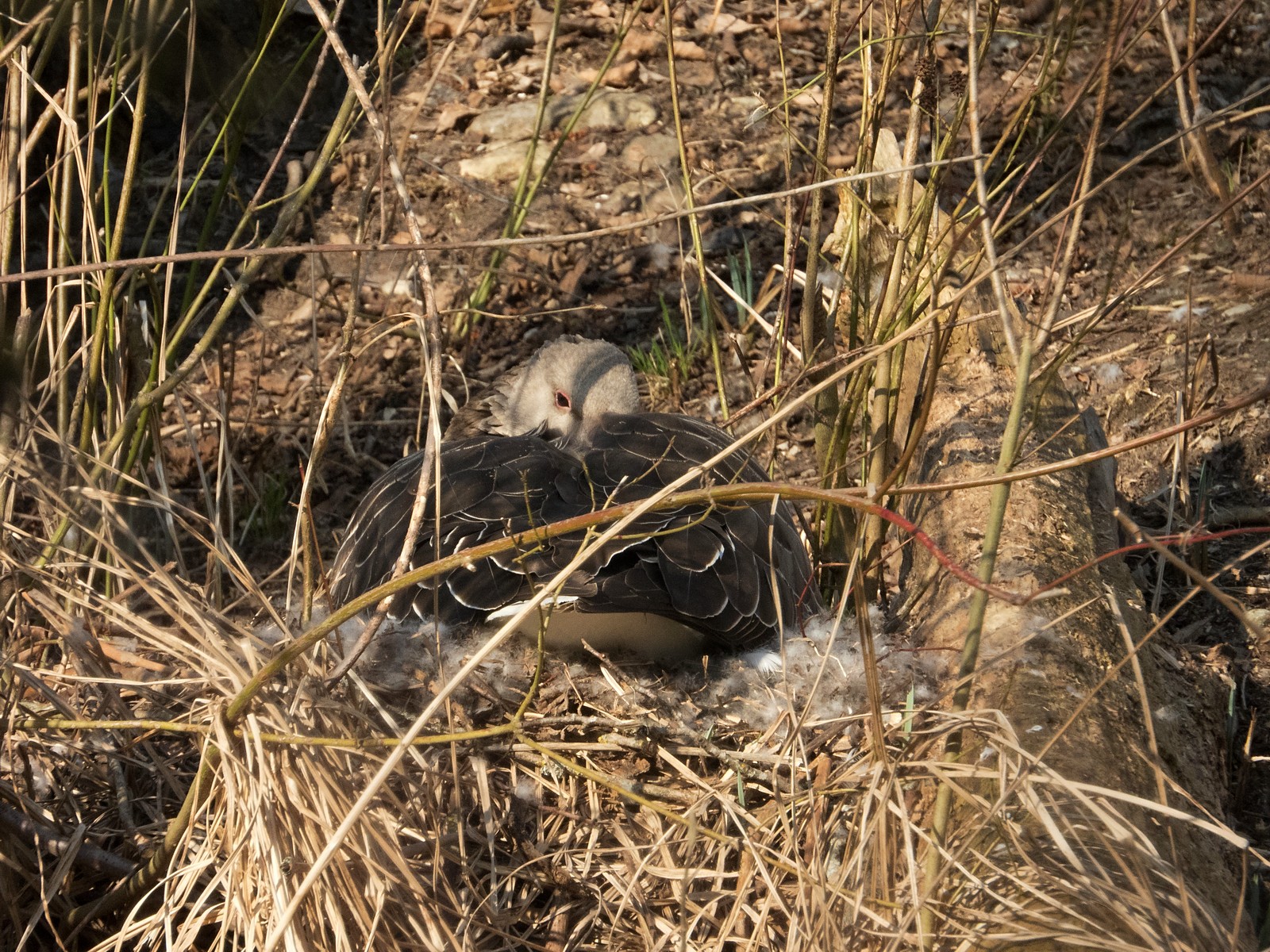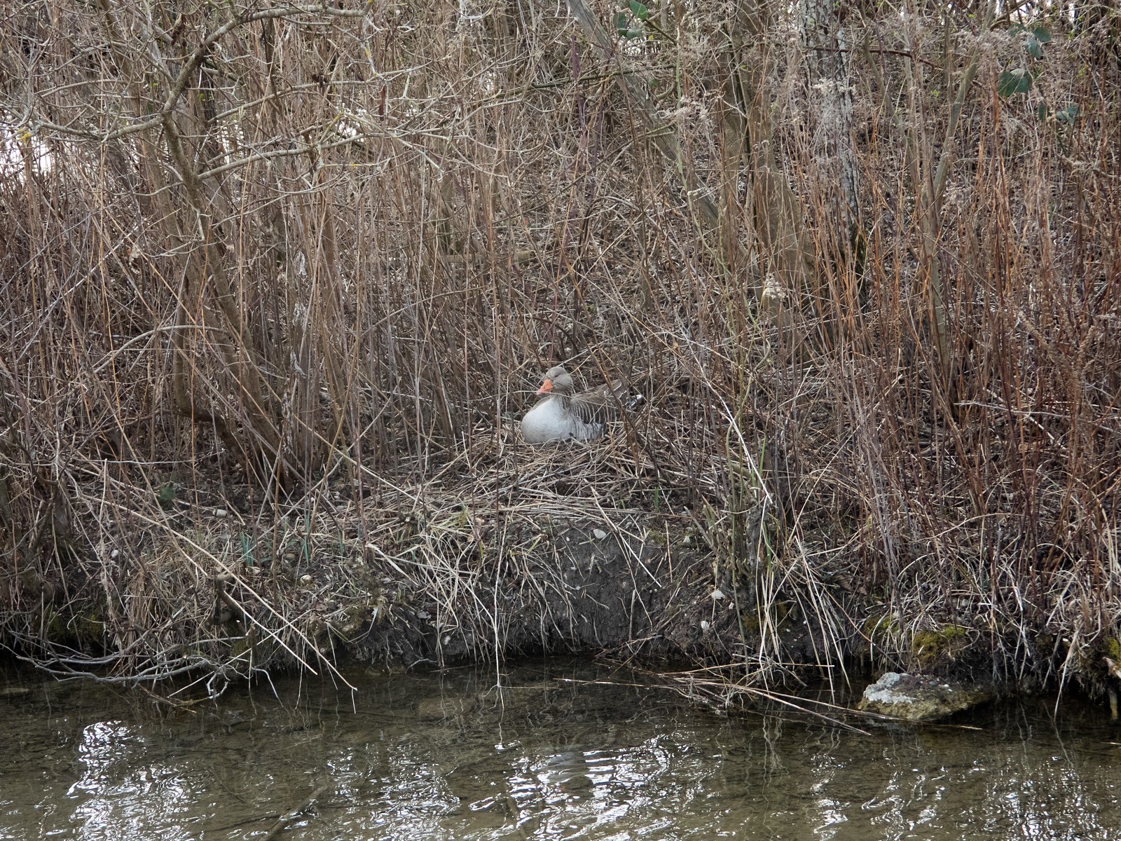 Nachfolgend ein Film: Bei anregender “Hintergrundmusik” setzt sich die auf kleiner Insel neben der Sitzbankgruppe brütende Graugans ins Nest.
