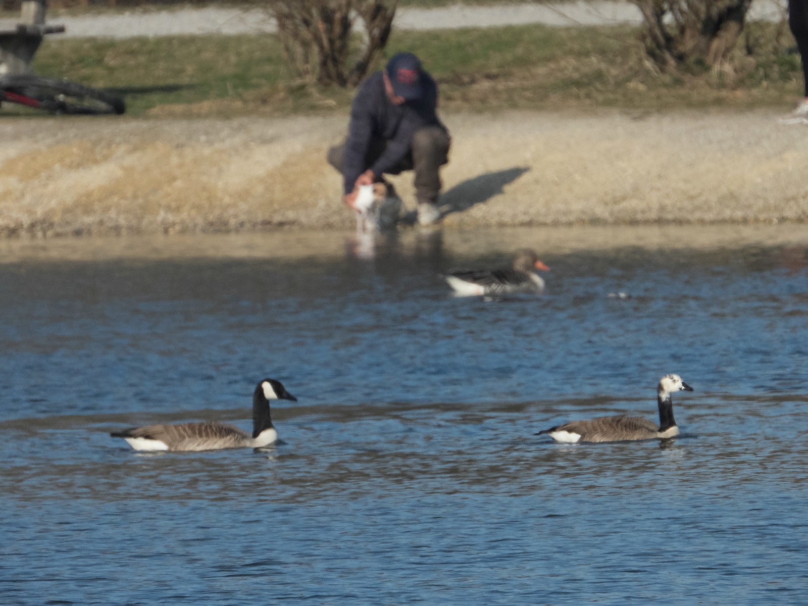 Derzeit halten sich sechs Kanadagänse im See auf. Offensichtlich drei Paare. Eine kleine Insel gegenüber der Eisvogelwand ist schon reserviert von einem Kanadaganspaar. Sobald eine Graugans Anstalten macht, die Insel zu betreten, geben die beiden Kanadagänse ein lautstarkes Konzert. Und vertreiben wütend die Graugans. Eine Graugans ist sichtlich hartnäckig um die Insel bemüht. Sie zieht aber immer den “Kürzeren”.