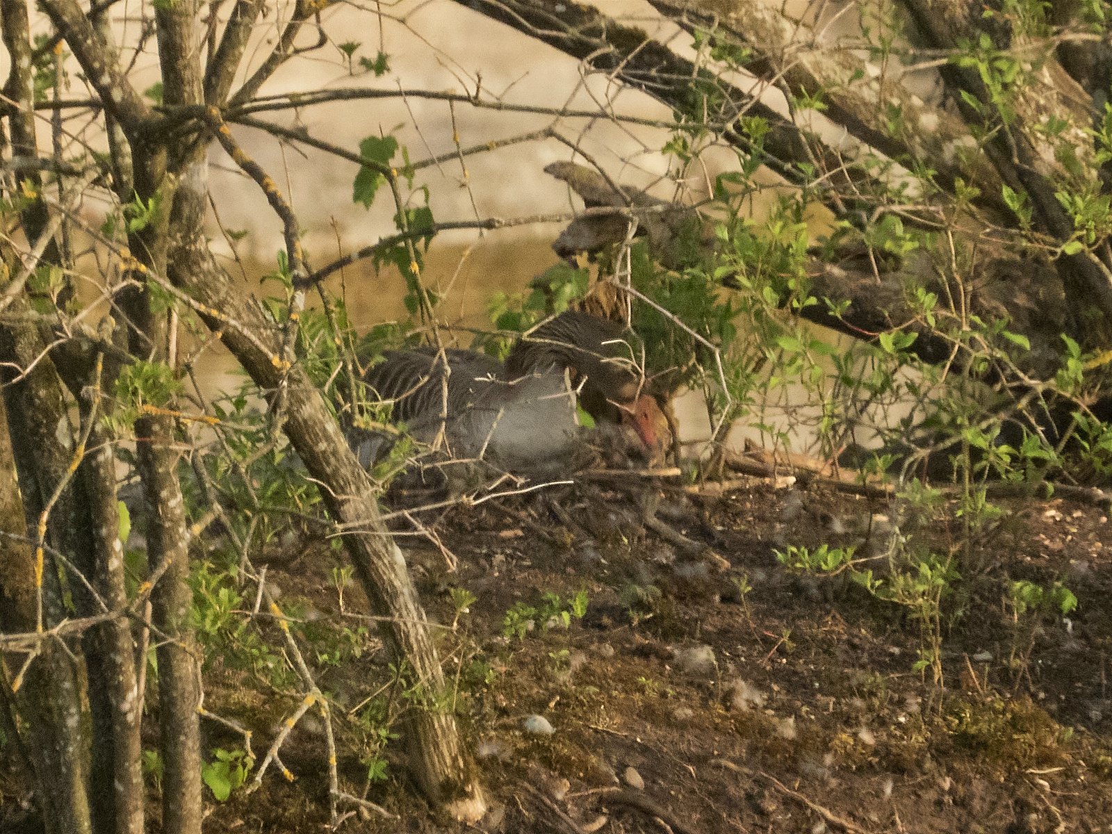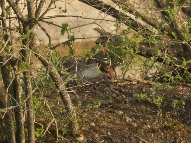 Die Graugans auf dem Nest schafft Pflanzenmaterial mit dem Schnabel heran. – Erst, nachdem sie das letzte Ei gelegt hat, beginnt die Gans zu brüten.