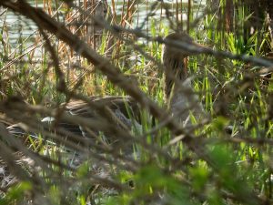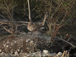 Wenige Meter vom Nest entfernt ruht sich Grauganspaar mit Anhang aus. Unter dem Gefieder der Mutter kommen zumindest zwei Gänsekinder zum Vorschein. Sichtbar im See sind jetzt noch drei besetzte Graugansnester. Ansonsten: Drei Kanadagänse und ein Höckerschwan im Nest.