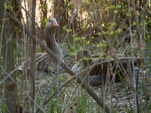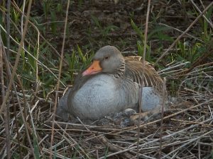 Bild oben: Nestsuche eines Gänsepaares. Vorne der Ganter, weiter hinten (rechts) die Gans. Konrad Lorenz stellt fest: „Der Ganter begleitet die Gans auf Schritt und Tritt, beteiligt sich aber nicht merklich an der speziellen Wahl des Nestortes. Beide sondern sich von der Schar ab und gehen weit umher. An einer für den menschlichen Beobachter schwer voraussagbaren Stelle beginnt die Gans schließlich, ein Nest anzulegen. (…) Noch vor der Eiablage bleibt die Gans oft eine Zeit lang auf dem Nistort liegen und kontrolliert, nach Ansicht Heinroths, auf diese Weise die Störungsfreiheit des Ortes.”