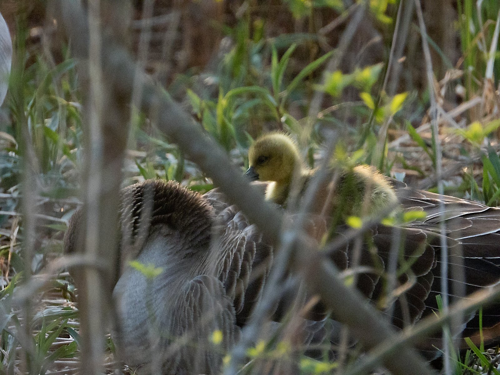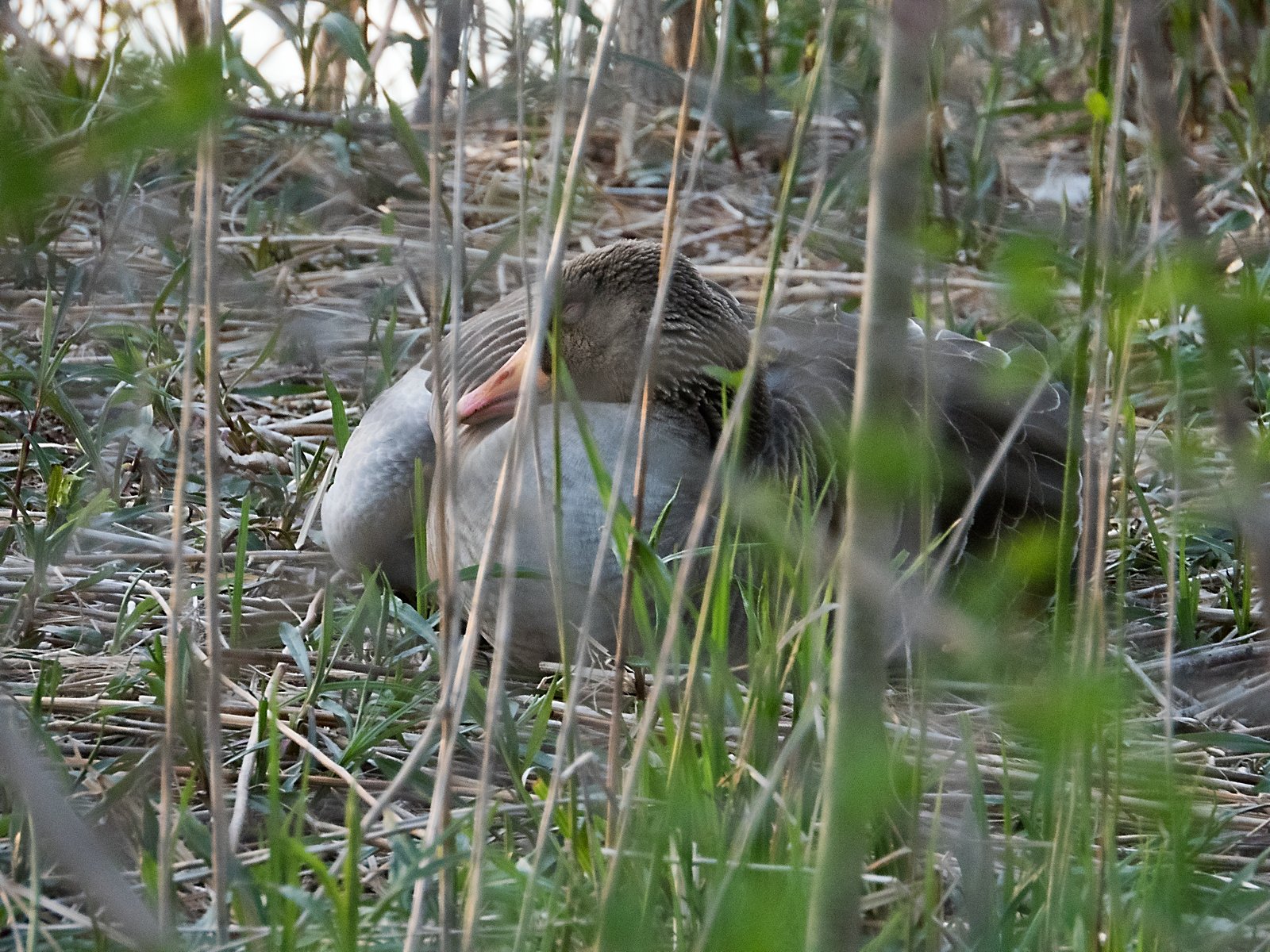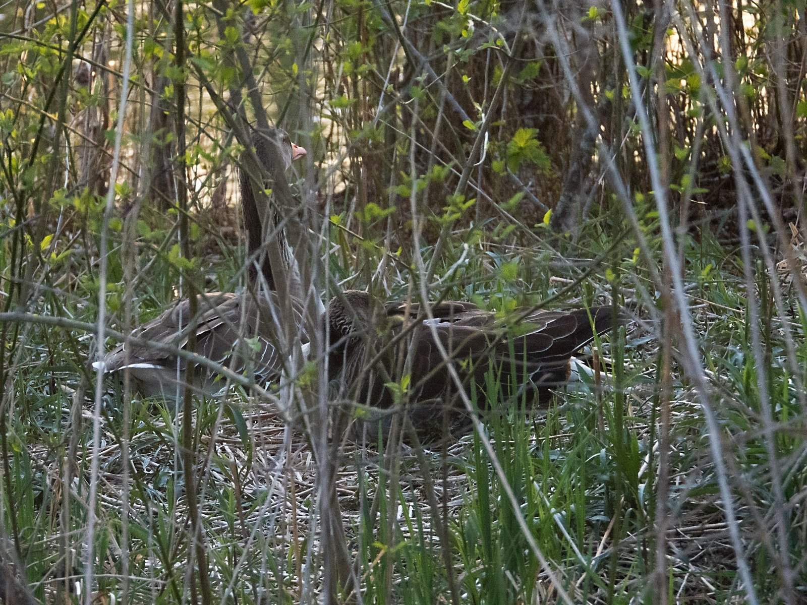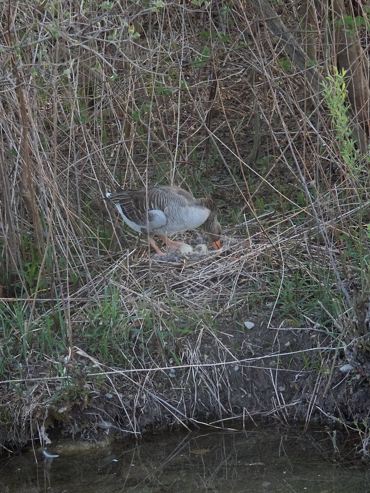 Wenige Meter vom Nest entfernt ruht sich Grauganspaar mit Anhang aus. Unter dem Gefieder der Mutter kommen zumindest zwei Gänsekinder zum Vorschein. Sichtbar im See sind jetzt noch drei besetzte Graugansnester. Ansonsten: Drei Kanadagänse und ein Höckerschwan im Nest.