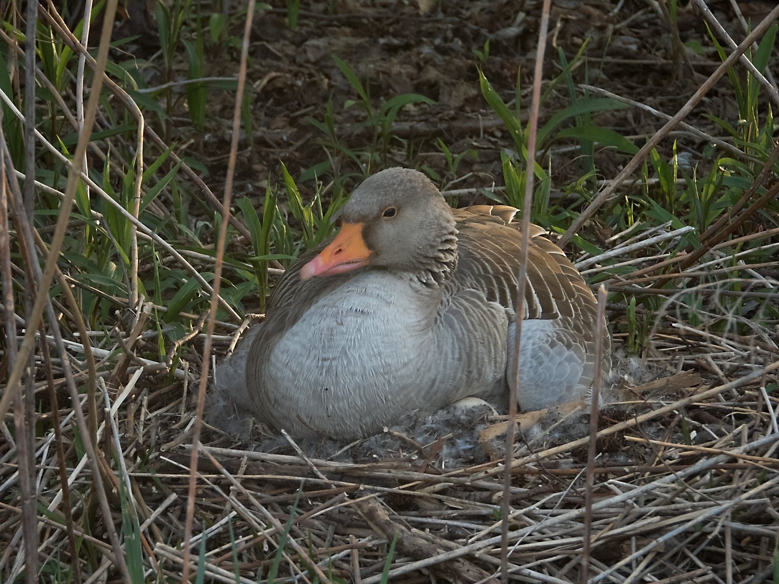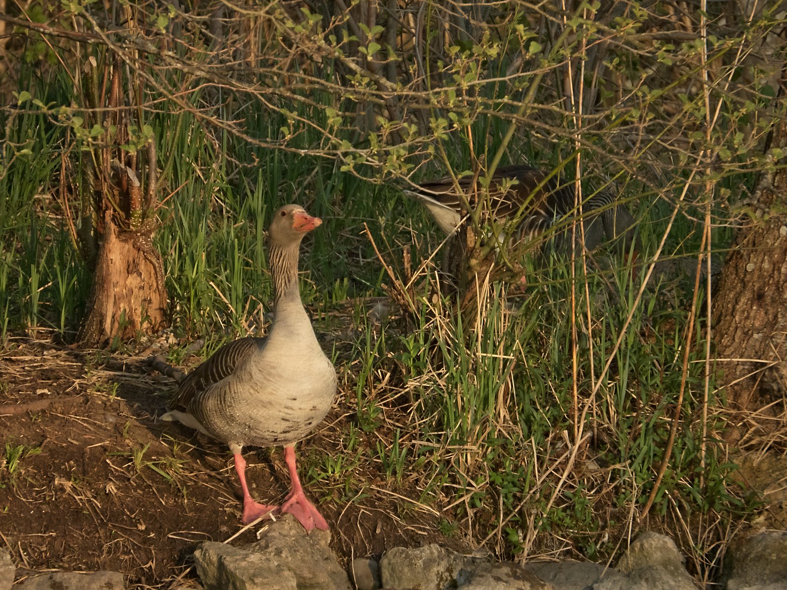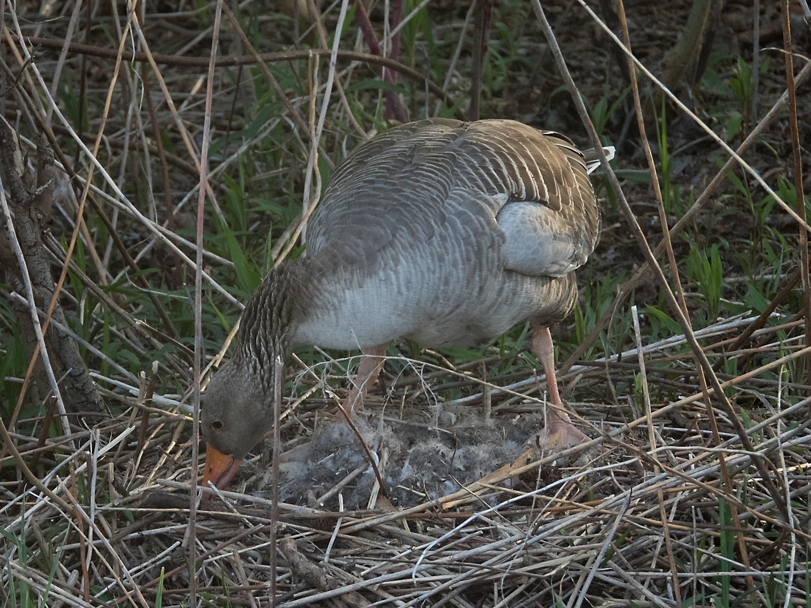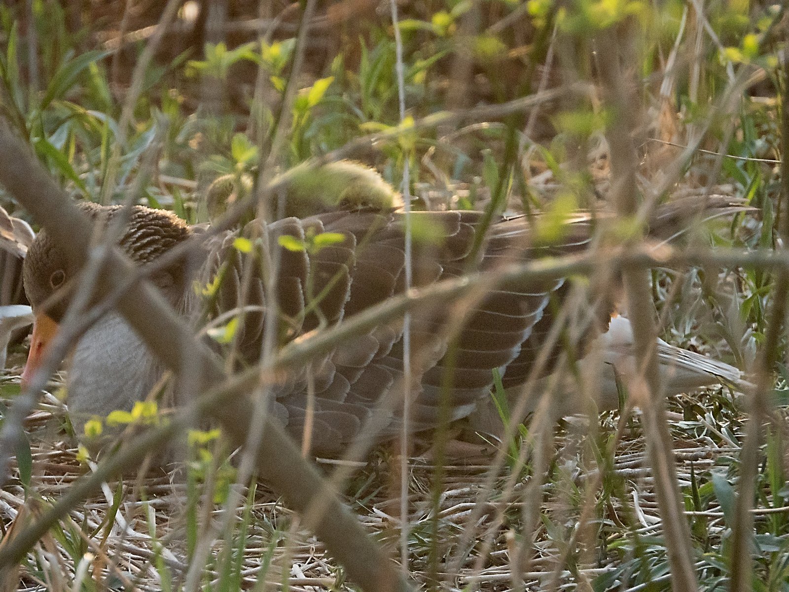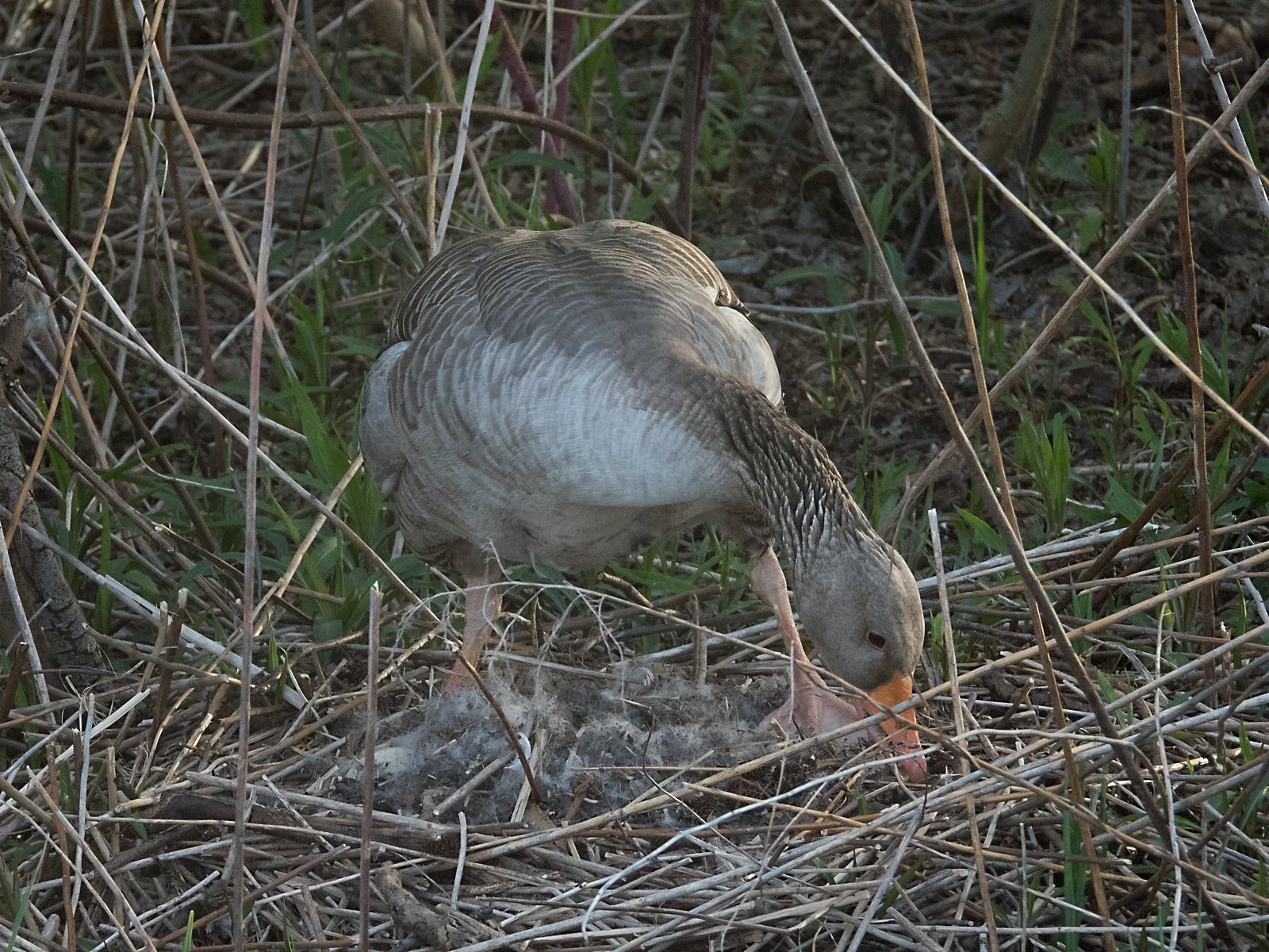 Wenige Meter vom Nest entfernt ruht sich Grauganspaar mit Anhang aus. Unter dem Gefieder der Mutter kommen zumindest zwei Gänsekinder zum Vorschein. Sichtbar im See sind jetzt noch drei besetzte Graugansnester. Ansonsten: Drei Kanadagänse und ein Höckerschwan im Nest.