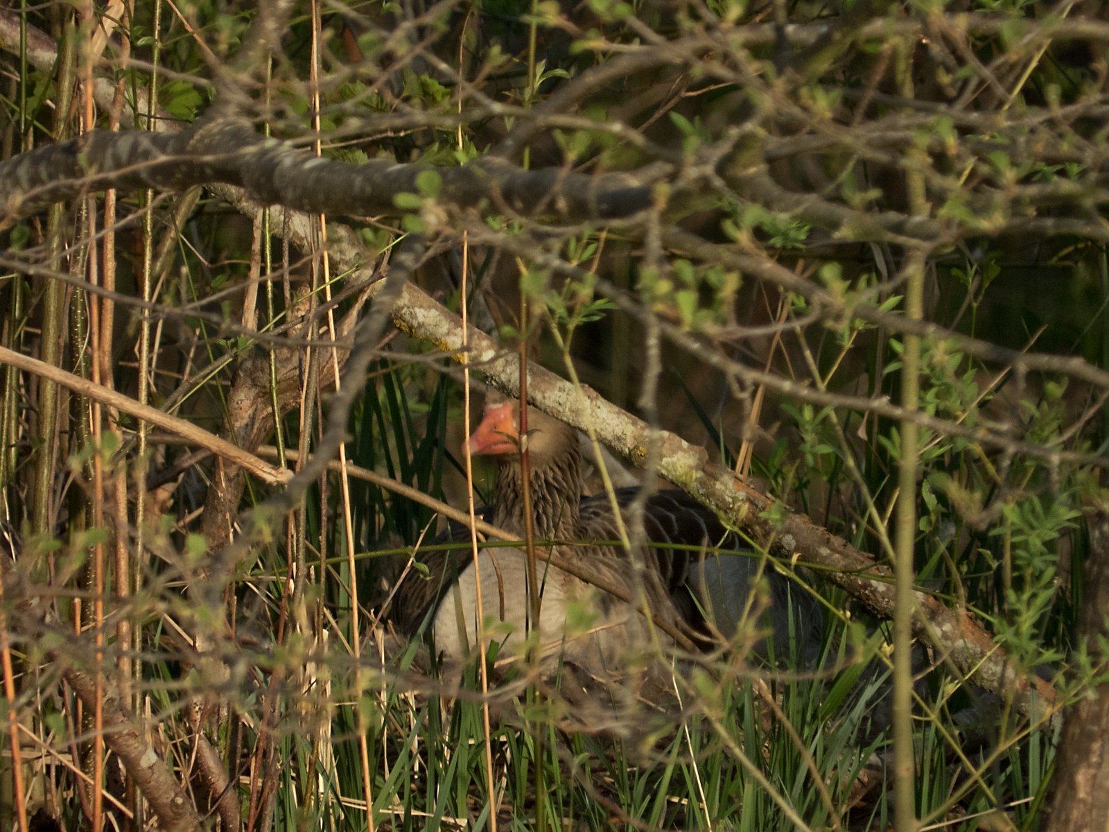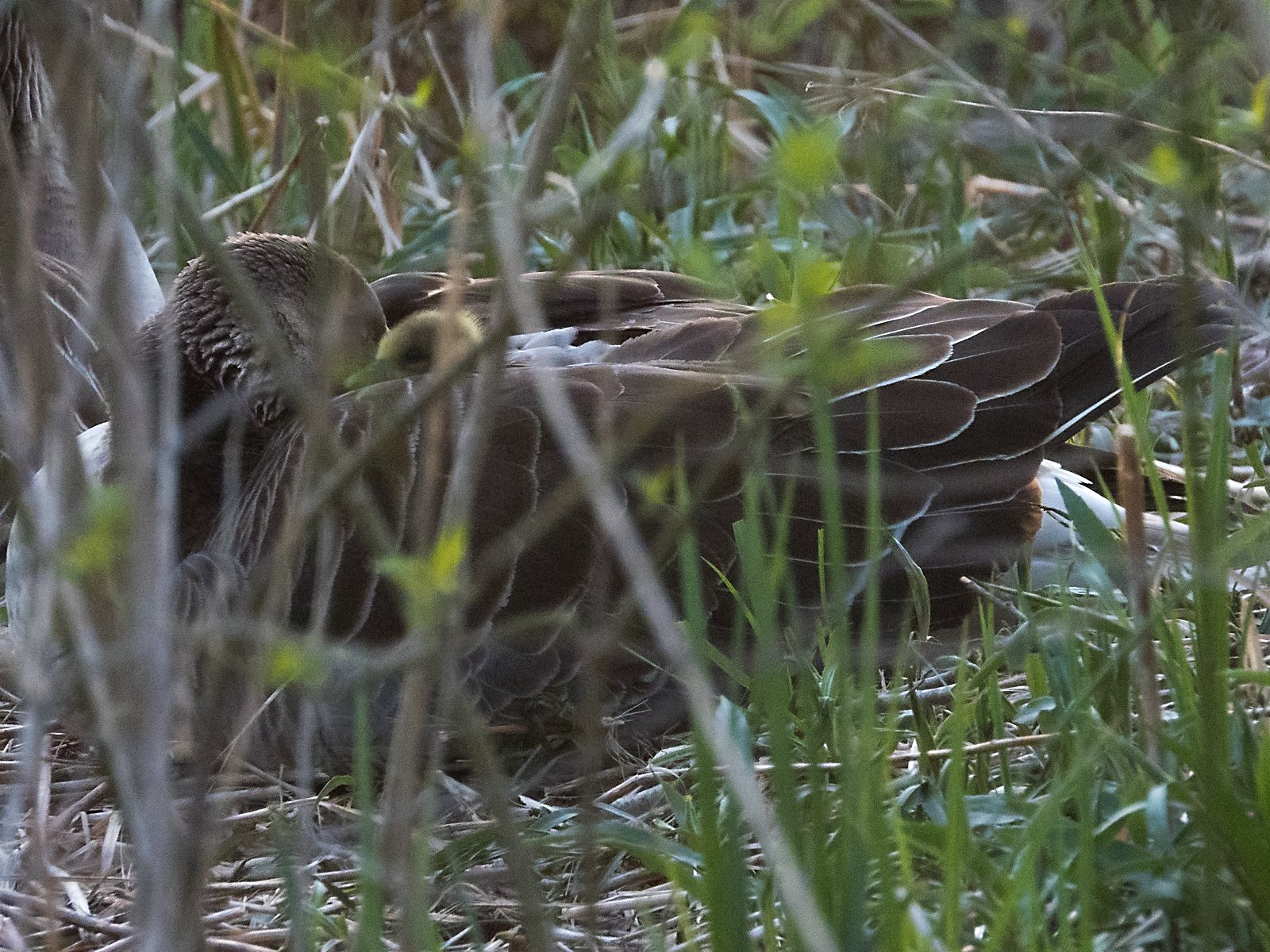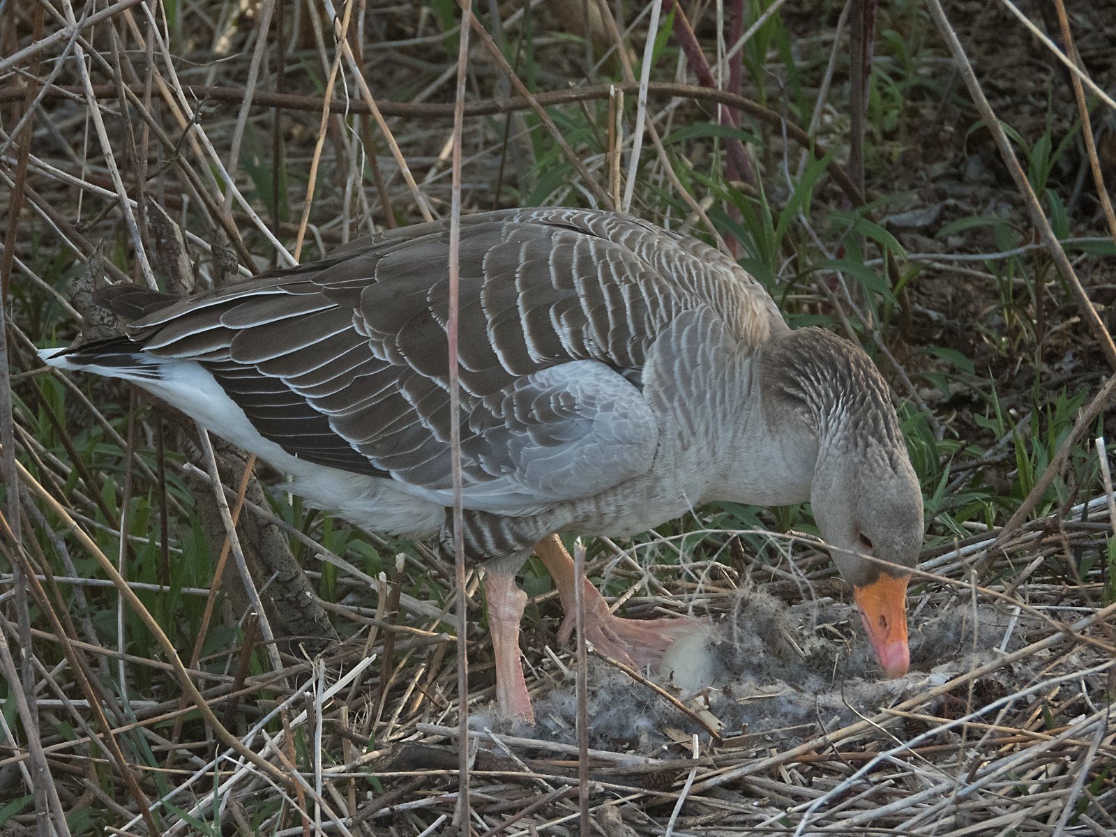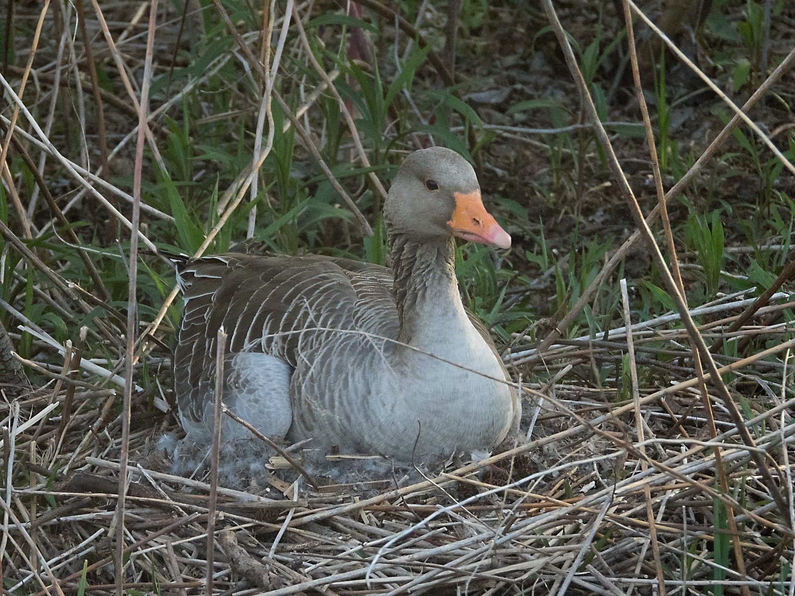 Wenige Meter vom Nest entfernt ruht sich Grauganspaar mit Anhang aus. Unter dem Gefieder der Mutter kommen zumindest zwei Gänsekinder zum Vorschein. Sichtbar im See sind jetzt noch drei besetzte Graugansnester. Ansonsten: Drei Kanadagänse und ein Höckerschwan im Nest.