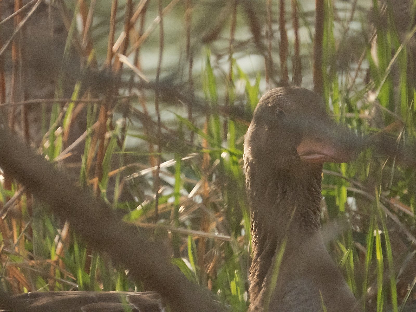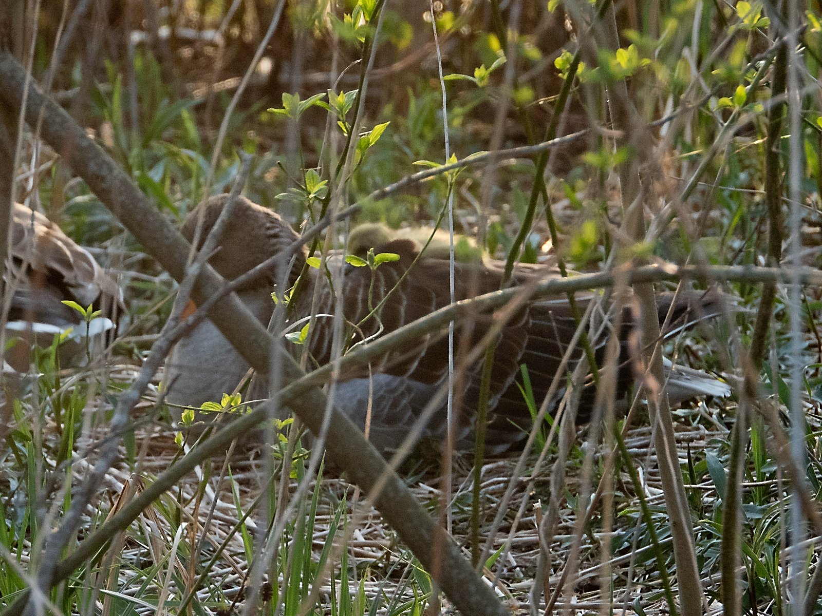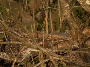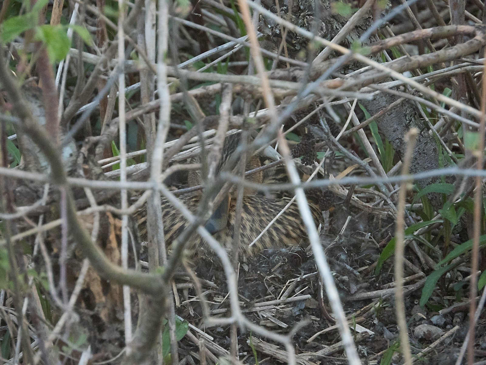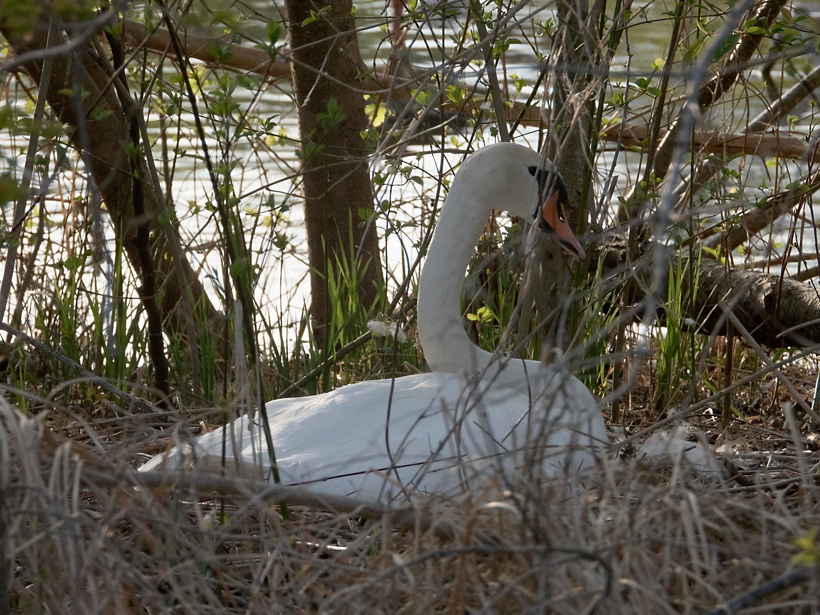 Wenige Meter vom Nest entfernt ruht sich Grauganspaar mit Anhang aus. Unter dem Gefieder der Mutter kommen zumindest zwei Gänsekinder zum Vorschein. Sichtbar im See sind jetzt noch drei besetzte Graugansnester. Ansonsten: Drei Kanadagänse und ein Höckerschwan im Nest.