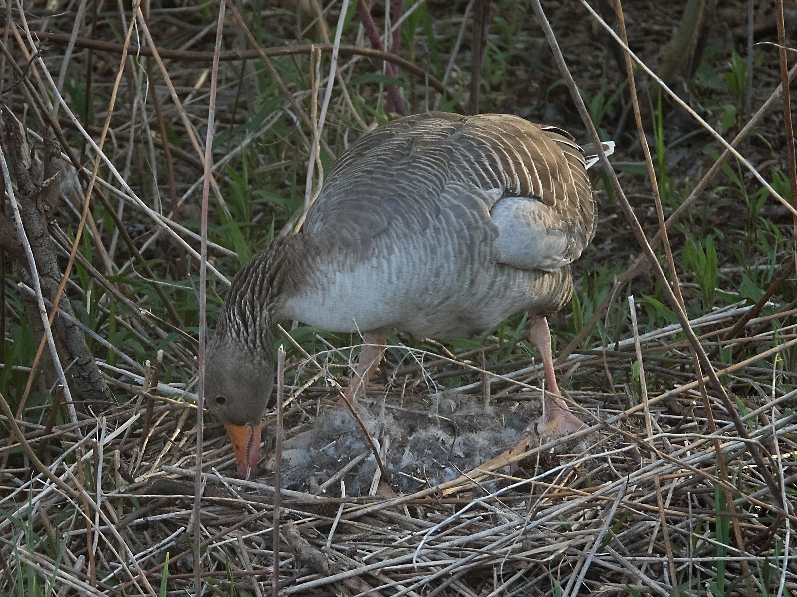 Im nachfolgenden Kurzfilm deckt eine schon länger brütende Graugans Nest ab kurz vor einem Ausflug. Konrad Lorenz schreibt in seinem „Jahr der Graugans”: „Bevor die Gans das Nest zur Brutpause verlässt, bedeckt sie die Eier sorgfältig mit den Daunen, mit denen das Nest ausgepolstert ist und die es in einem Wall umgeben. (…) Während der Brutpause wirkt die Daunenschicht weniger als Wärmeschutz – die Eier sollen ja auskühlen – als vielmehr als Sichtschutz gegen räubernde Raben und Krähen. (…) Das Bedecken der Eier mit den Daunen und Nestmaterial schützt vor Krähen und Raben, die optisch nach Beute suchen, nicht aber vor Raubsäugetieren, die sich nach dem Geruch orientieren.”