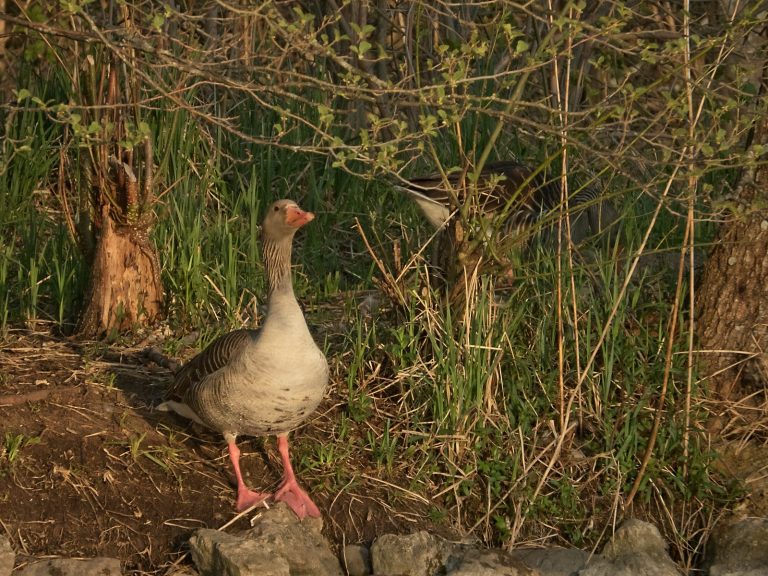 Bild oben: Nestsuche eines Gänsepaares. Vorne der Ganter, weiter hinten (rechts) die Gans. Konrad Lorenz stellt fest: „Der Ganter begleitet die Gans auf Schritt und Tritt, beteiligt sich aber nicht merklich an der speziellen Wahl des Nestortes. Beide sondern sich von der Schar ab und gehen weit umher. An einer für den menschlichen Beobachter schwer voraussagbaren Stelle beginnt die Gans schließlich, ein Nest anzulegen. (…) Noch vor der Eiablage bleibt die Gans oft eine Zeit lang auf dem Nistort liegen und kontrolliert, nach Ansicht Heinroths, auf diese Weise die Störungsfreiheit des Ortes.”