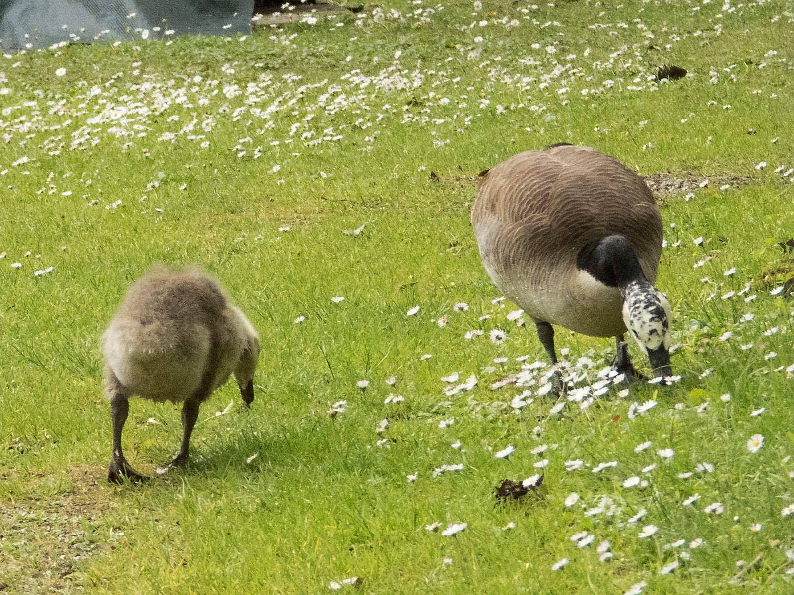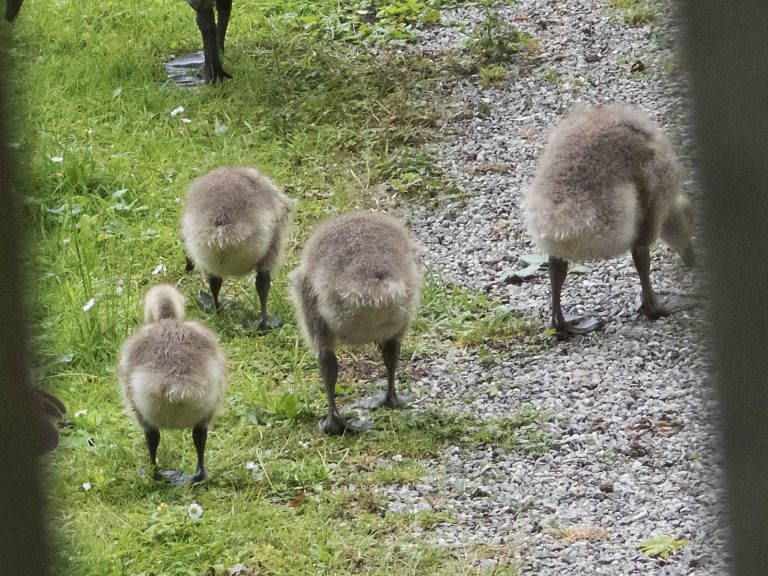 Fotografiert durch den Zaun: Im Fischteichgeände hielten sich wieder die beiden Kanadagans-Familien auf. Ein Paar mit einem Gössel, ein weiteres Paar mit drei Gösseln.