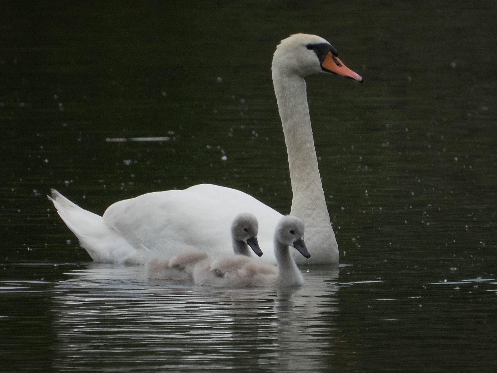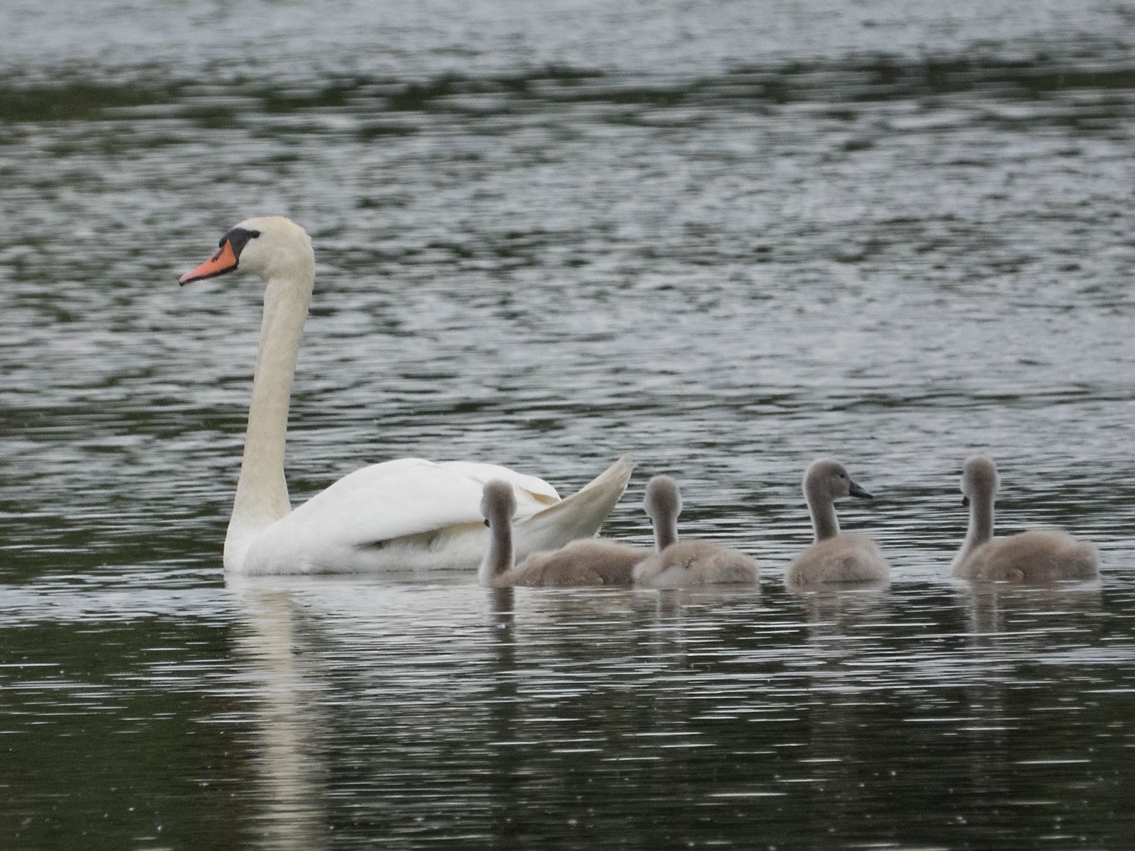 Eine Zeitlang war das Schwanenpaar mit sechs Jungvögeln unterwegs, zuletzt gesehen am 24. Mai 2020. An den folgenden Beobachtungstagen (26. Mai, 29. Mai, 5. Juni) war die Schwanenfamilie am Stausee nicht zu sehen. Heute wieder da mit nur noch vier Jungschwänen.