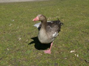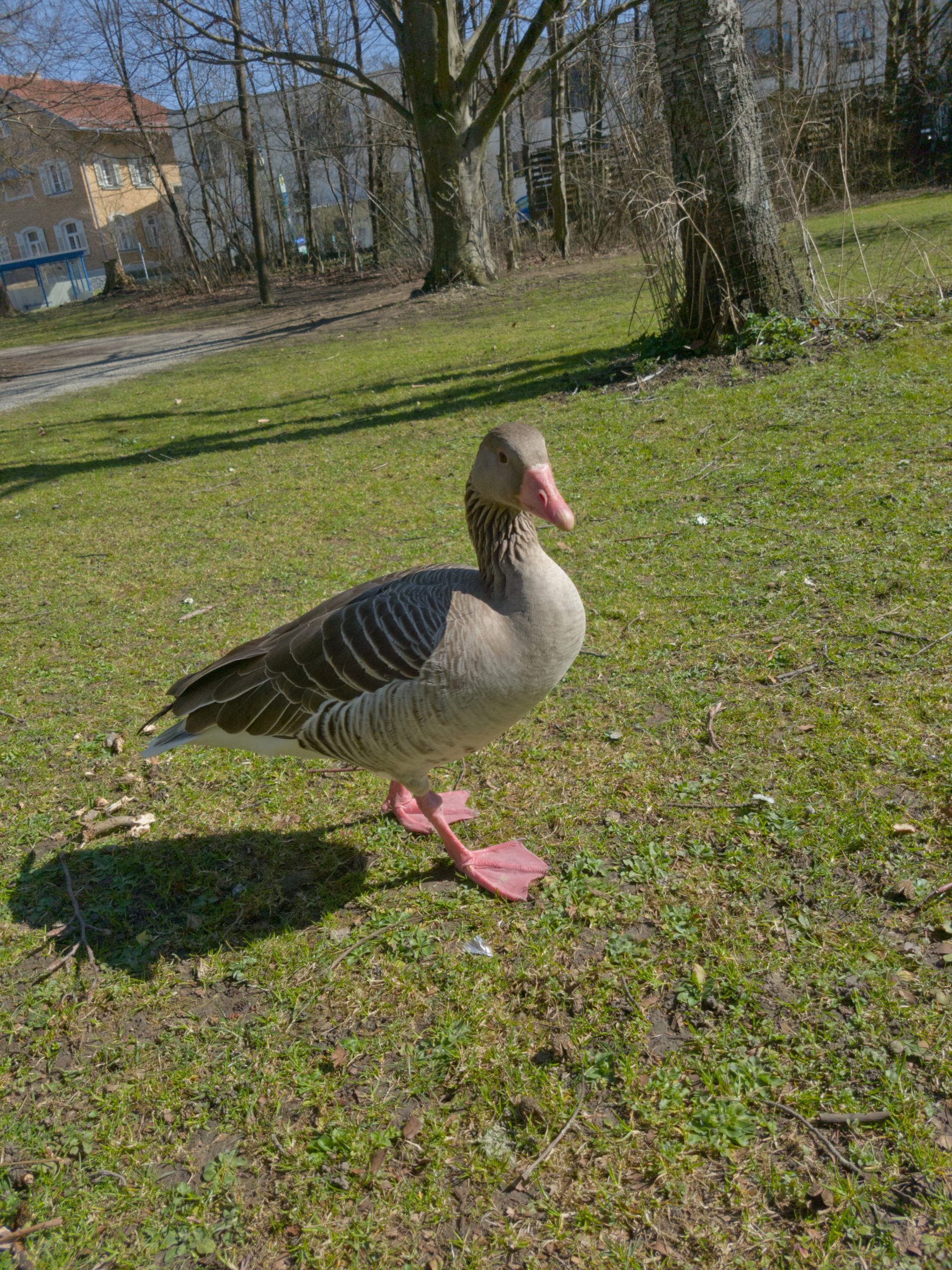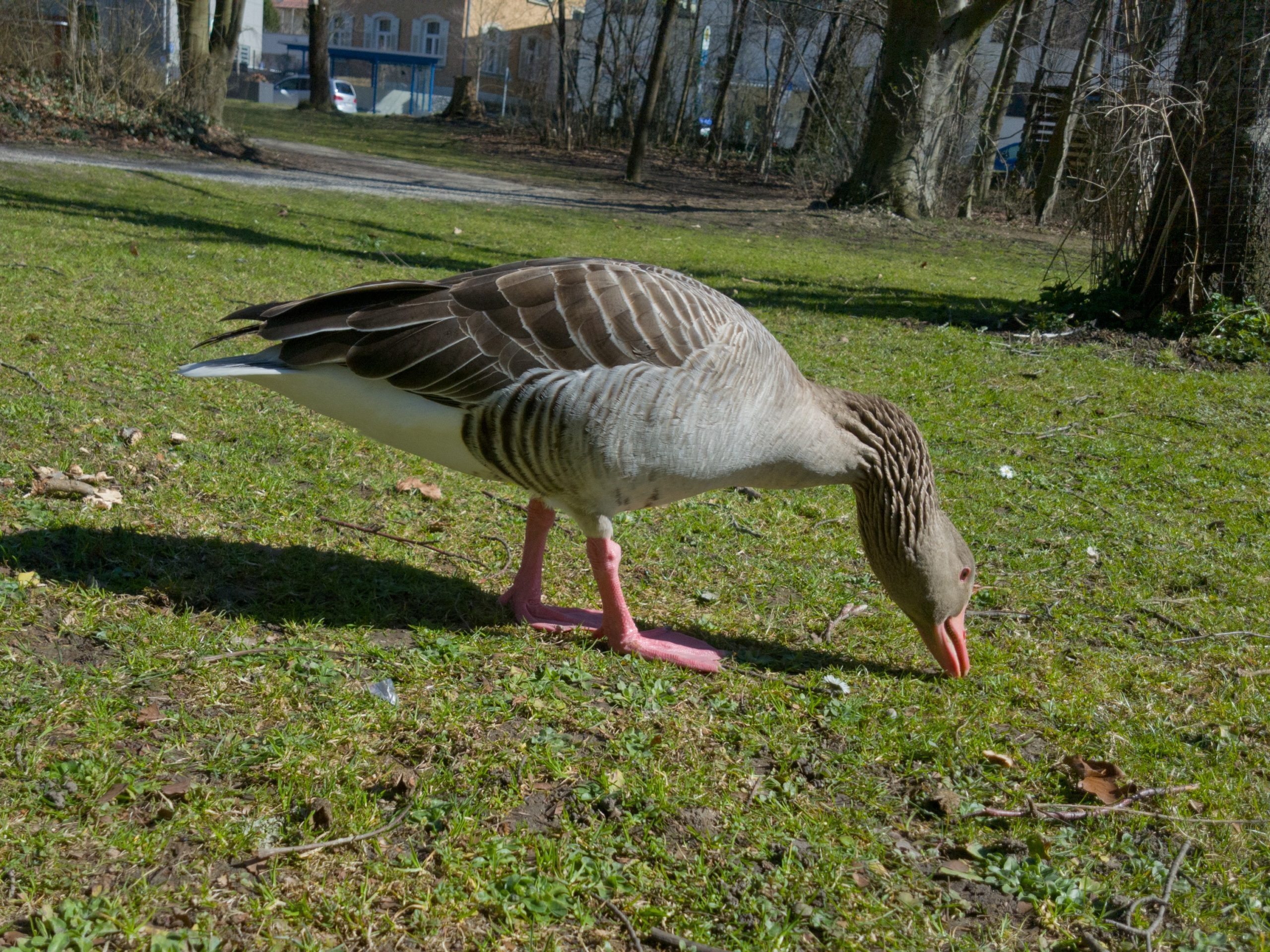 Einige Stunden später verweilt die Graugans immer noch in der Tandlerschlucht: Auf der kurz gemähten Rasenfläche.
